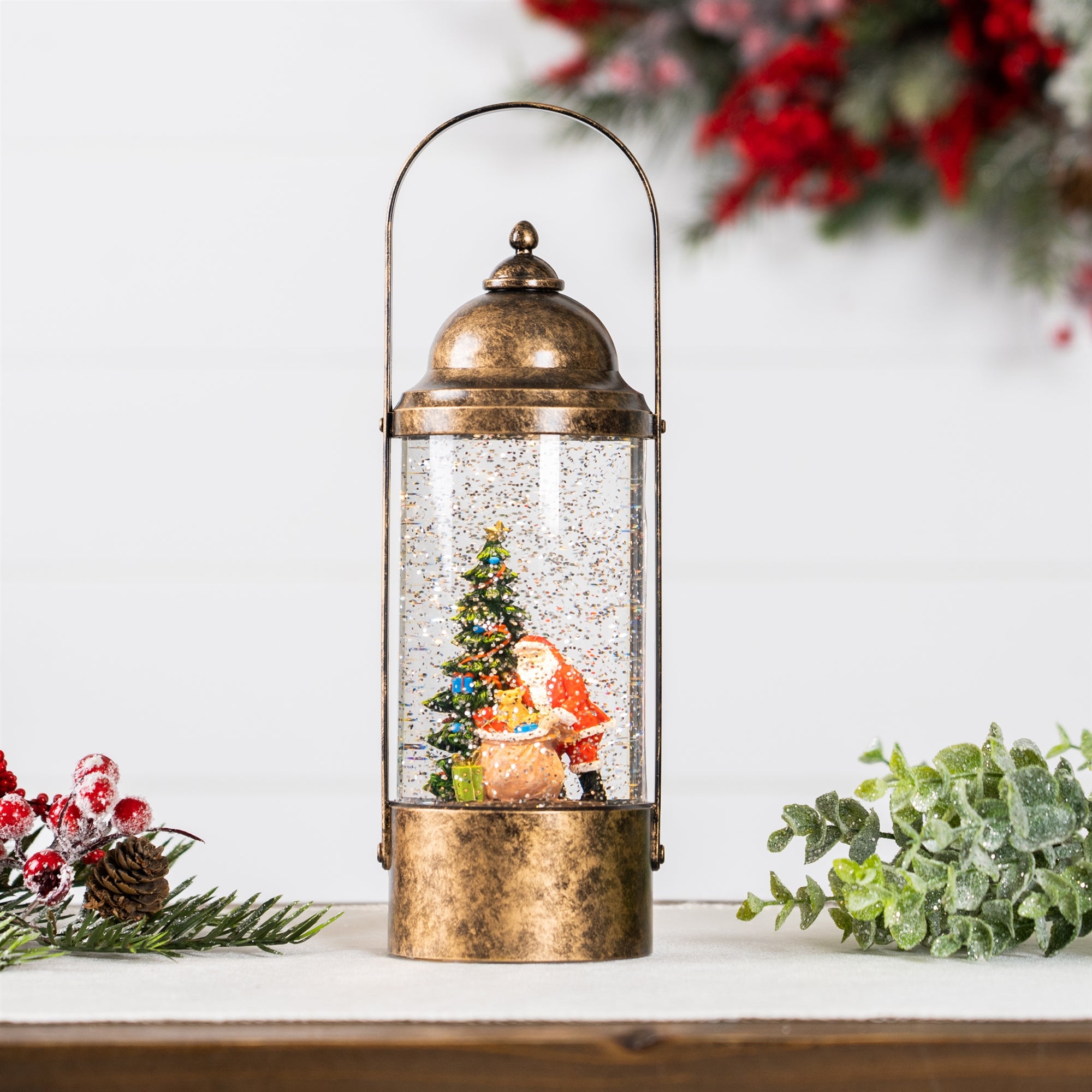 Illuminate your home this Christmas season with the stunning Lighted Lantern Snow Globe with Santa accent. This piece features Santa putting presents under the tree inside of a lantern-shaped snow globe. The traditional lantern design paired with the sparkley globe contents makes this set a great addition to any style of holiday decor. The piece also includes a 6-hour timer function. Requires 3 AA Batteries (not included)., Snow Globe w/Santa 12"H Plastic 6 Hr Timer 3 AA Batteries Not Included or USB Cord Included