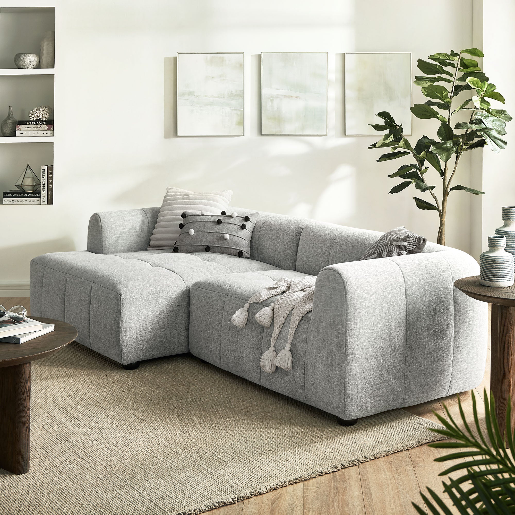 Step into the world of refined relaxation with the Liana Modular Sectional Sofa, a stylish centerpiece that combines comfort with a chic, casual aesthetic. Embodying a retro-modern look, the Liana Sofa Couch features dense foam padding encased in fabric upholstery. It includes a left chaise and right chair, making it ideal for stretching out and relaxing after a long day. Enhancing the modular sofaÕs allure, subtly tufted seats blend with a neatly stitched grid pattern that extends into the gently curved armrests and backrests, imparting a touch of geometric flair. Its low profile and deep seating are thoughtfully designed to cater to contemporary aesthetics while providing ample space to relax. Durably constructed and supported by solid wood bun feet with non-marking floor glides, the Liana Left-Facing Sectional Couch stands strong, ready to support countless lounge times. Perfectly at home in a chic modern living room or a mid-century modern lounge, the Liana Left-Facing Chaise Couch beckons you to unwind in style. Weight Capacity of Each Seat: 500 lbs. One - Liana Left-Facing Modular Sofa with Chaise