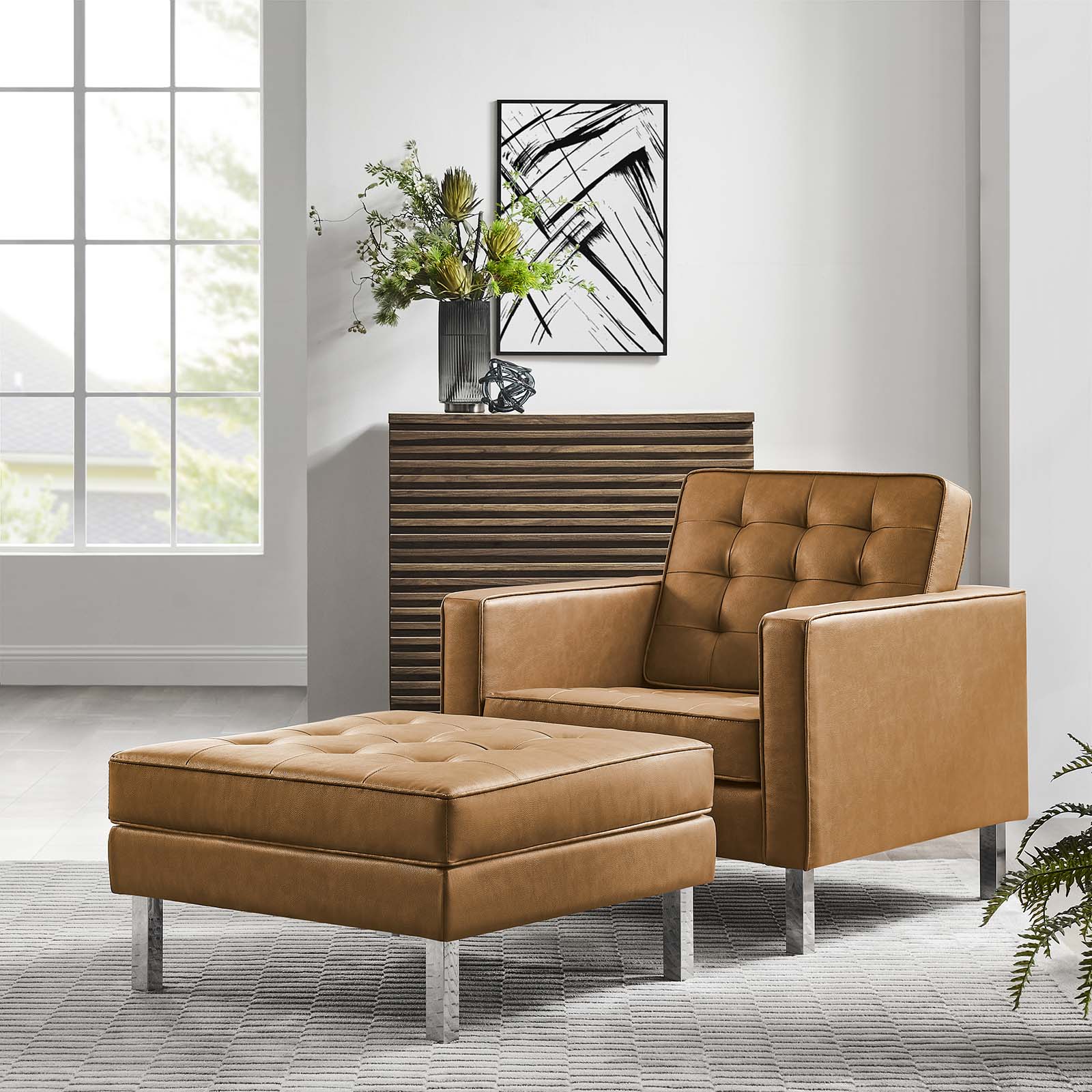 Revolutionize your living room furniture with the iconic Loft Vegan Leather Armchair and Ottoman Set. Adding visual depth to your living room or lounge space, Loft features soft and durable vegan leather upholstery accented with classic biscuit tufting. This modern accent chair and ottoman set showcases a captivating linear design, tubular stainless steel legs, and non-marking foot caps that protect flooring. Inspired by the richness of mid-century modern style, this upholstered chair and ottoman are the preferred choice of living rooms, office reception areas, and lounge spaces. Assembly required. Set Includes: 1 Armchair, 1 Ottoman. Weight Capacity of Each: 330 lbs. Set Includes: One - Loft Tufted Armchair One - Loft Tufted Ottoman