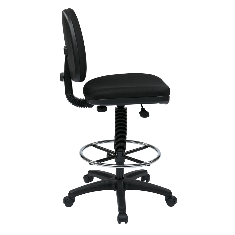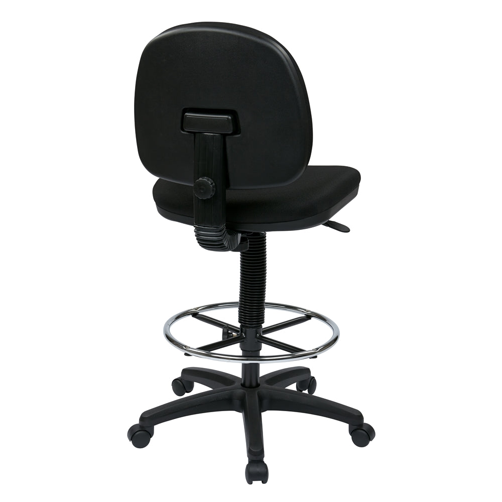 Economical Chair with Chrome Teardrop Footrest (footrest is not adjustable). Pneumatic Drafting Chair with Fabric Stool and Back. Height Adjustment 23" to 33" overall. Heavy Duty Nylon Base with Dual Wheel Carpet Casters