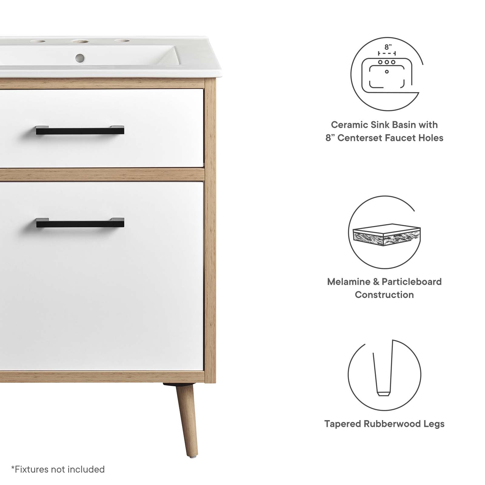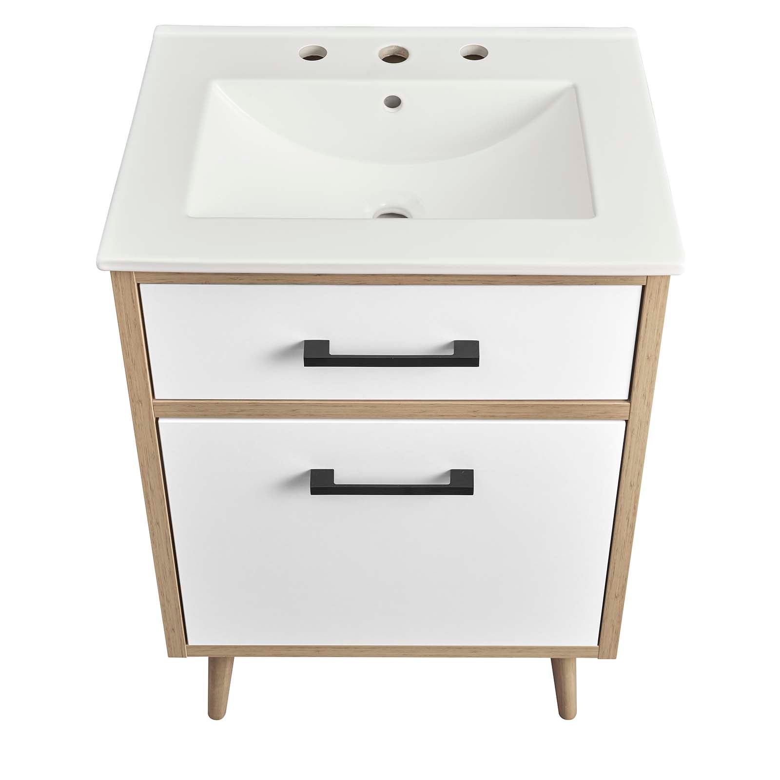 The Maverick 24" Bathroom Vanity is the perfect blend of modern style and convenience. Crafted with particleboard and melamine, the simple yet elegant design is enhanced by modern metal handle pulls and tapered and splayed rubberwood legs. The spacious full-glide bottom drawer provides plenty of storage space for all your bathroom essentials, while the fixed top drawer adds complementing style. This bathroom vanity cabinet features a ceramic sink basin with an integrated countertop and 8" centerset faucet holes. This bathroom vanity instantly transforms your space, creating a beautiful, modern look that will last for years. Includes non-marking foot glides to protect flooring. Assembly required. Fixtures not included. Set Includes: One - Cayman 24" Bathroom Sink One - Maverick 24" Bathroom Vanity Cabinet - Sink Basin Not Included