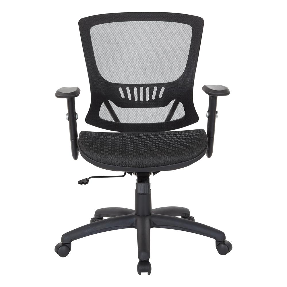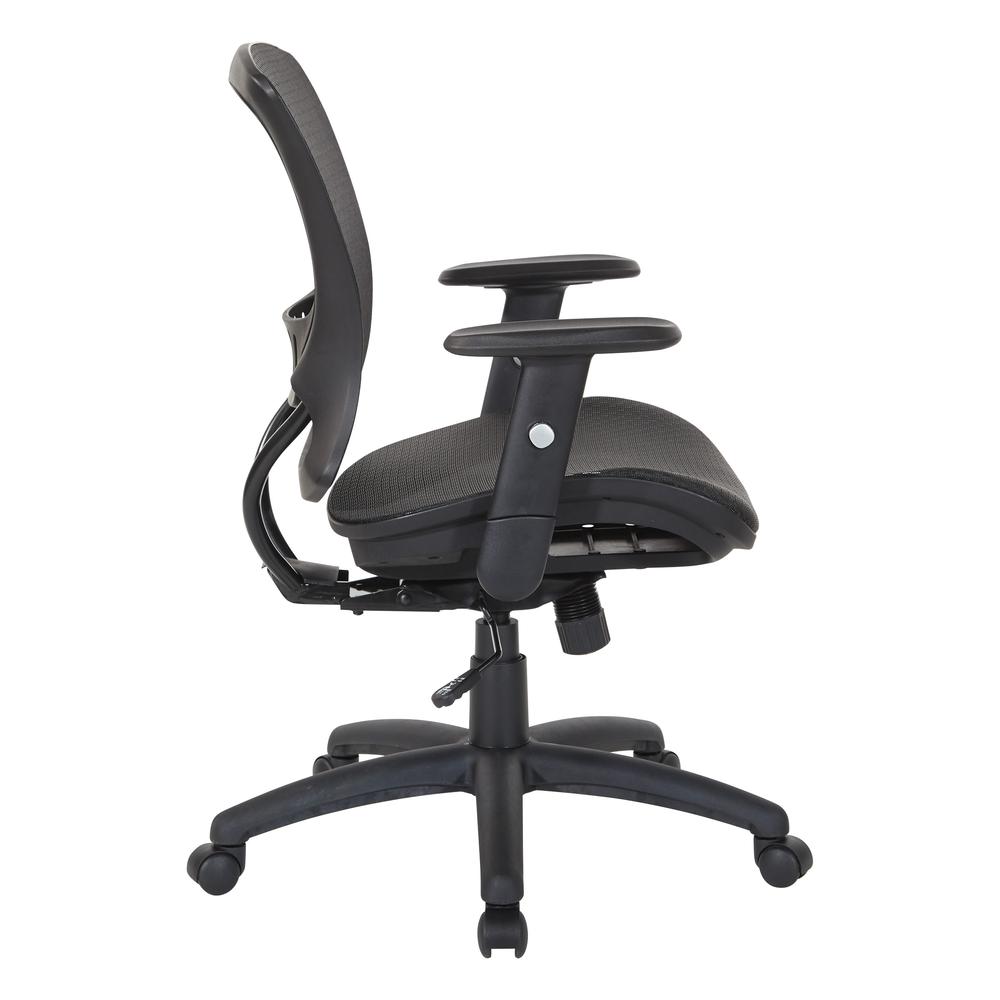 Stay on task with this black office chair designed for comfort. Sink in to the gentle curve of the breathable mesh seat and back with built in lumbar support while you are hard at work. Multiple adjustments allow for a completely customized seating experience including a 2-to-1 synchro tilt control with adjustable tilt tension, height adjustable arms and nylon base with dual wheel carpet casters. Upgrade your office seating with the Work Smart Mesh Seat & Back Managers Chair.