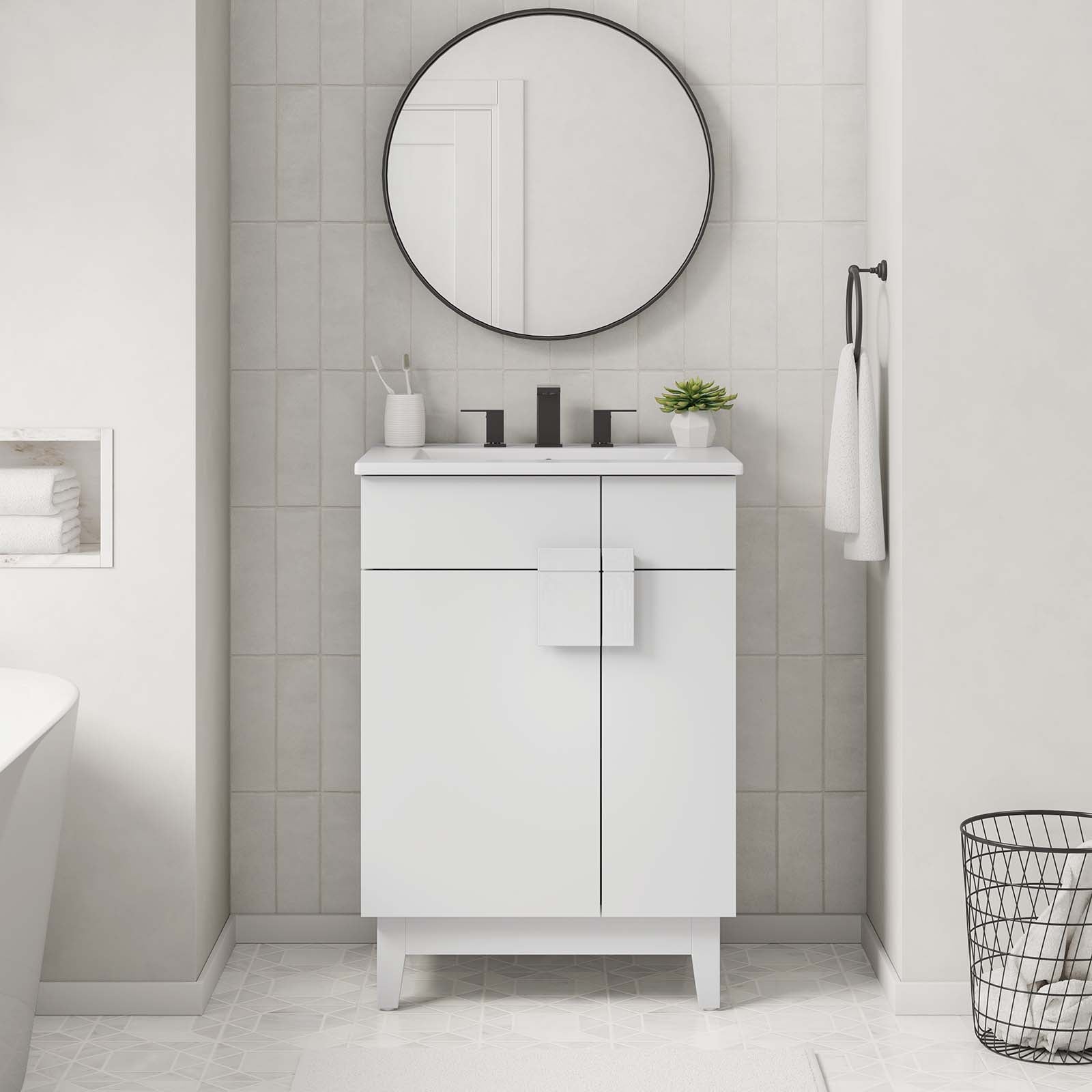 Update your bathroom decor with the modern allure of the Miles 24" Bathroom Vanity. Made from particleboard adorned with a sleek melamine laminate, this vanity stands on four tapered rubberwood legs, equipped with non-marking tack glides to protect flooring. Featuring a curved ceramic basin sink with an integrated countertop and 8-inch centerset faucet holes, this vanity is a complete bathroom upgrade. The unique design showcases two metal hinged doors, featuring an intriguing asymmetrical layout, and accentuated by a split square handle for a modern touch. Inside, you'll find ample storage on two spacious shelves, perfect for organizing bathroom essentials. Miles features a cut-out design to accommodate plumbing. Fixtures not included. Assembly required. Weight Capacity: 200 lbs. Set Includes: One - Cayman 24" Bathroom Sink One - Miles 24" Bathroom Vanity Cabinet (Sink Basin Not Included)