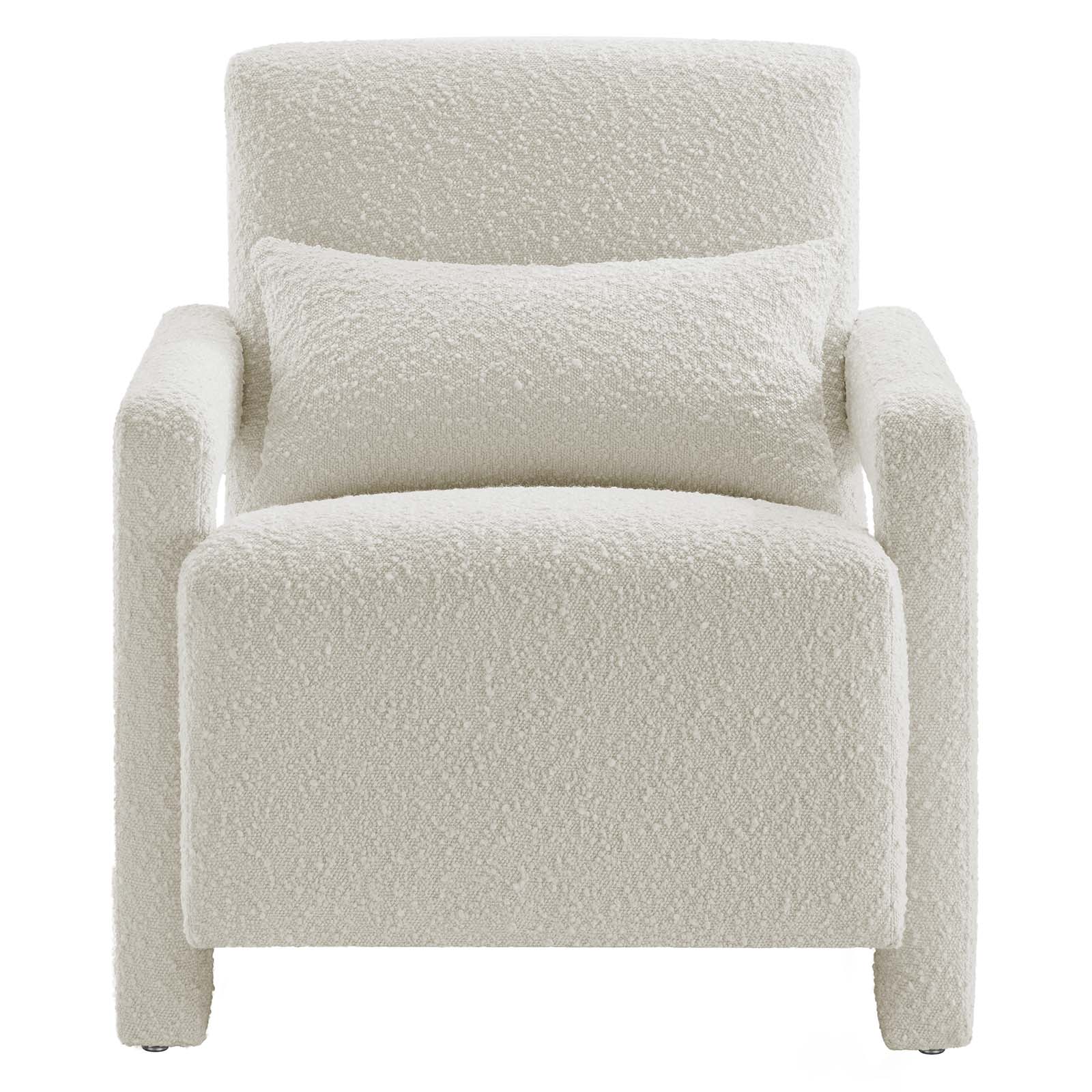 Step into a world of unmatched comfort and style with the Mirage Boucle Accent Armchair. Designed to bring modern style to your living room, entryway, lounge area, or office, this accent chair boasts squared, angular armrests that exude contemporary elegance. Its boucle fabric, with a charming nubby texture, adds a delightful tactile element to the overall aesthetic. Not only does this upholstered armchair make a chic statement in a home or apartment, but it also offers a cozy seating experience. Crafted with a sturdy wood frame and equipped with a sinuous spring support system and dense foam padding, this club chair ensures a premium level of comfort and durability. This stylish living room chair is complete with a complementary accent pillow and non-marking foot glides to safeguard your floors. Weight Capacity: 330 lbs. Set Includes: One - Mirage Armchair
