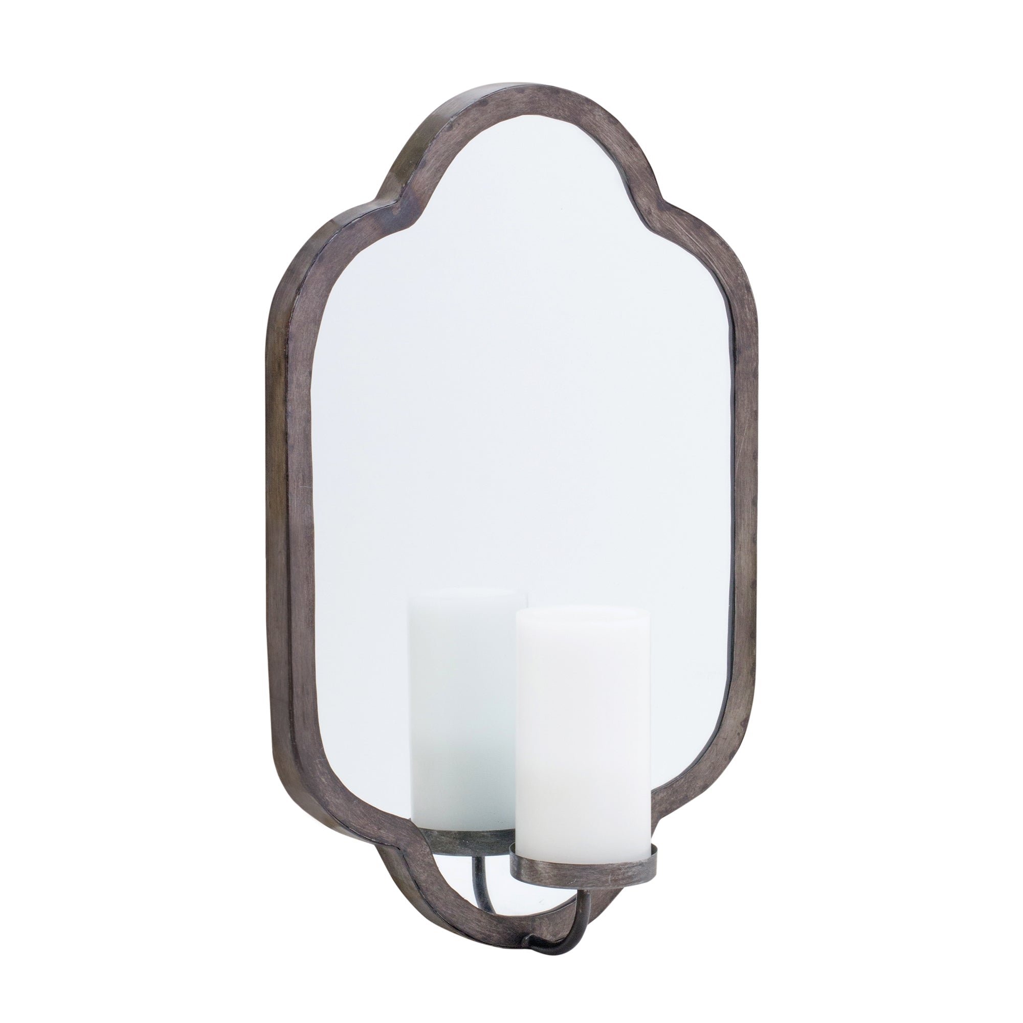 Make a statement in your home with this set of Mirror Wall Sconces! This unique set of wall decor features beautiful regal mirror shapes, vintage candle holder accents, and a brushed black finish. Crafted from quality iron metal with delicate glass mirror, this contemporary wall sconce set is sure to add a touch of modern elegance to your home. Upgrade your decor and make your space truly stand out with the Mirror Wall Sconces!, Mirror Wall Sconce (Set of 2) 13"L x 20"H Iron/Glass