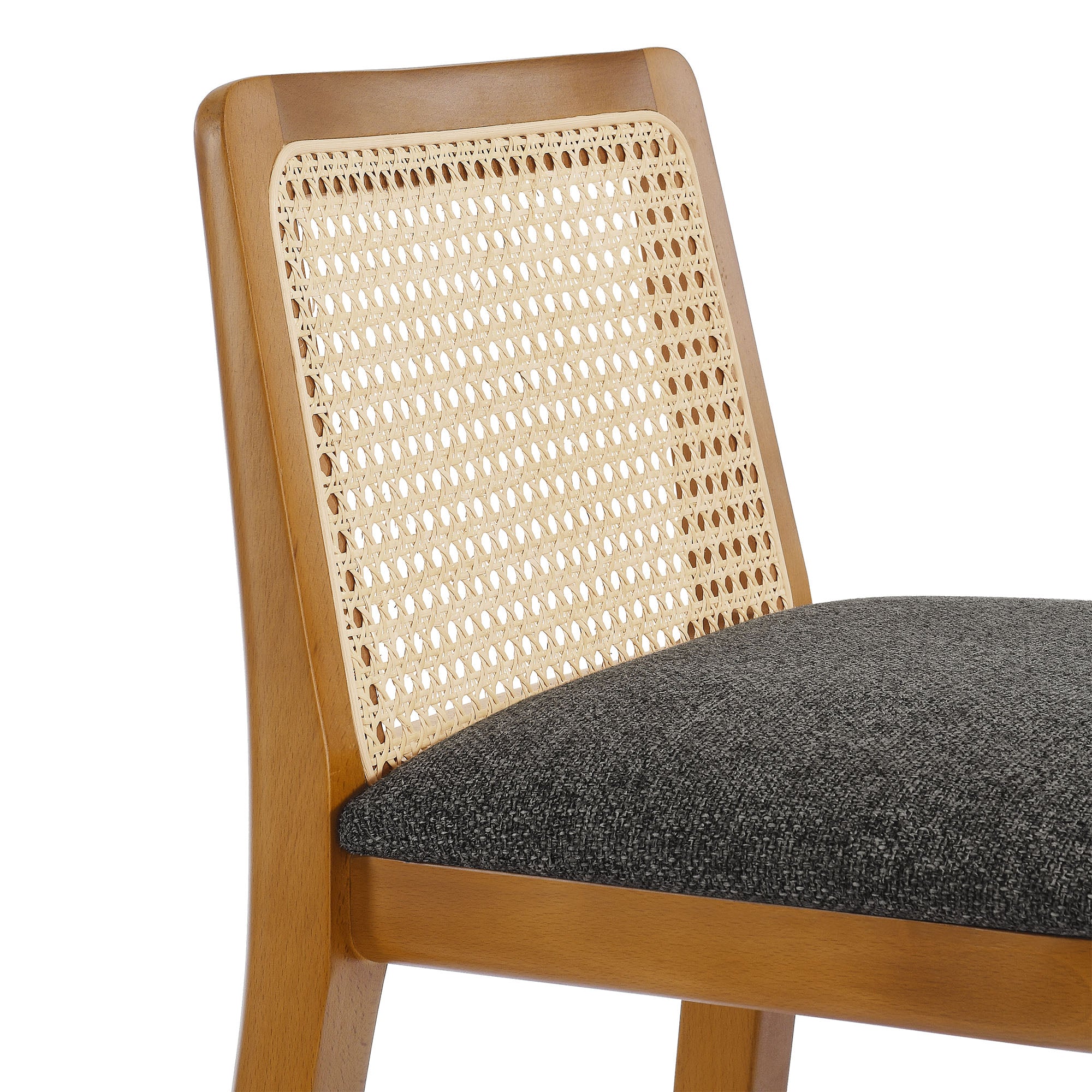 • Bullets: Beech Wood Frame Cane Rattan Backrest Dense Foam Padding Fabric Upholstered Seat Non-Marking Floor Glides Arrives Fully Assembled