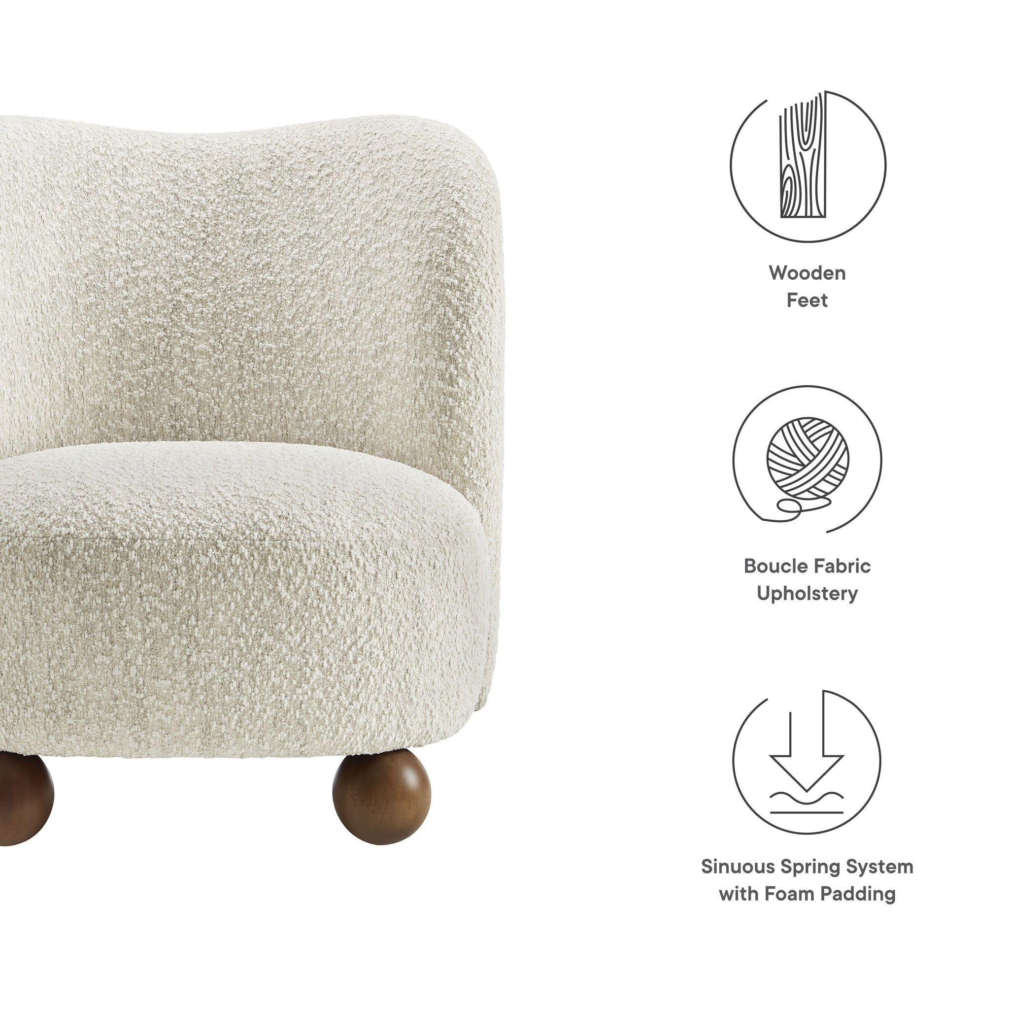 • Bullets: Boucle Fabric Upholstery Soft Aesthetic with Rounded Contours Dense Foam Padding Wooden Ball Feet Sinuous Spring Support Non-Marking Foot Pins Assembly Required