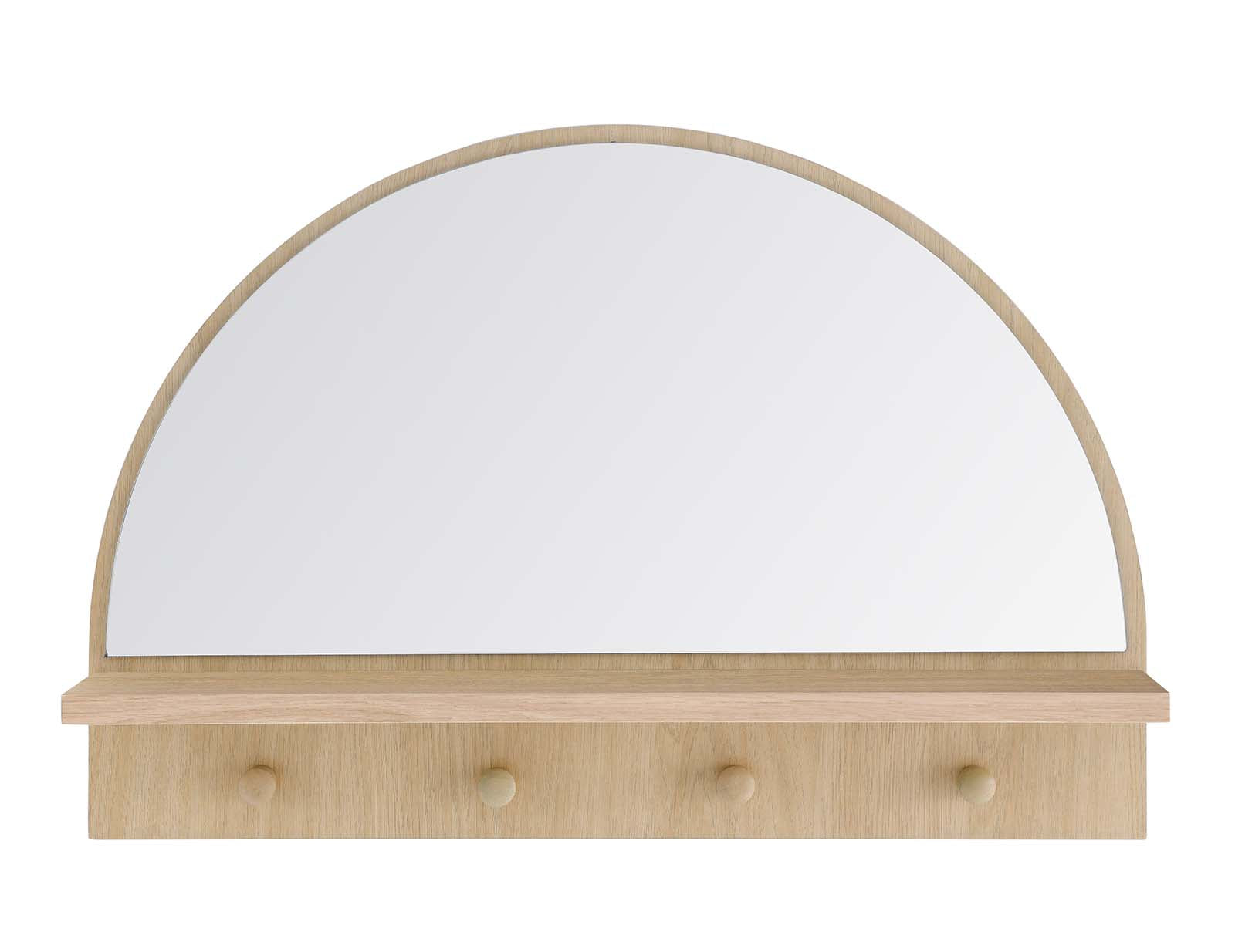 A modern addition to your home or apartment, the Moonbeam Arched Mirror is an eye-catching addition. Featuring an arched design with a shelf and four pegs, this wall mirror is ideal for the entryway, hallway, or mudroom. The sleek style and half-circle silhouette bring a touch of modern elegance to your space while offering organization and storage for keys, dog leashes, hats, and a variety of other small items. This mirror is crafted from mindi wood and particleboard with a wood grain laminate that brings a rich, organic aesthetic to its surroundings. Minimal assembly required. Set Includes: One - Monbeam Arched Mirror