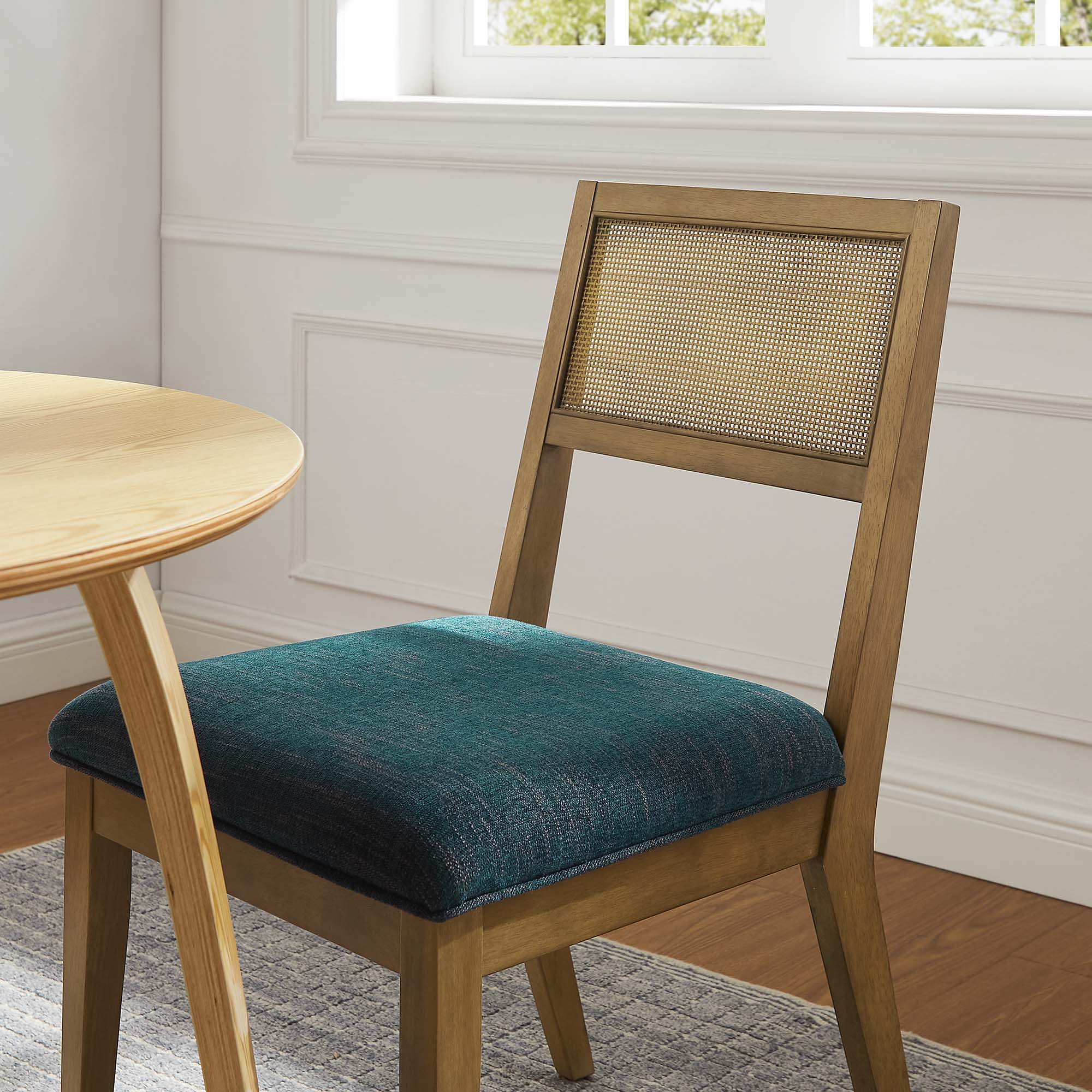 Experience the blend of natural textures and contemporary flair with the Nimba Wood Dining Chairs. Set on a solid rubberwood foundation, these mid century modern dining chairs showcase the inviting warmth of natural wood. The seats, upholstered in woven heathered fabric and padded with foam, provide cozy and supportive comfort, are ideal for extended periods of sitting, whether for dining or conversation. A backrest accented with a faux rattan weave gracefully tops off the design, entwining with the rattan chair's wooden frame to create a continuous and chic aesthetic. Tapered legs enhance the modern farmhouse chair silhouettes, complemented by foot glides for floor protection. These armless cane back dining chairs promote a clean, uncluttered look, perfect for any dining setting. The set includes two wood dining accent chairs with cane back for a cohesive dining experience. Weight Capacity for Each Side Chair: 507 lbs. Two - Nimba Faux Rattan Dining Chairs - Set of 2