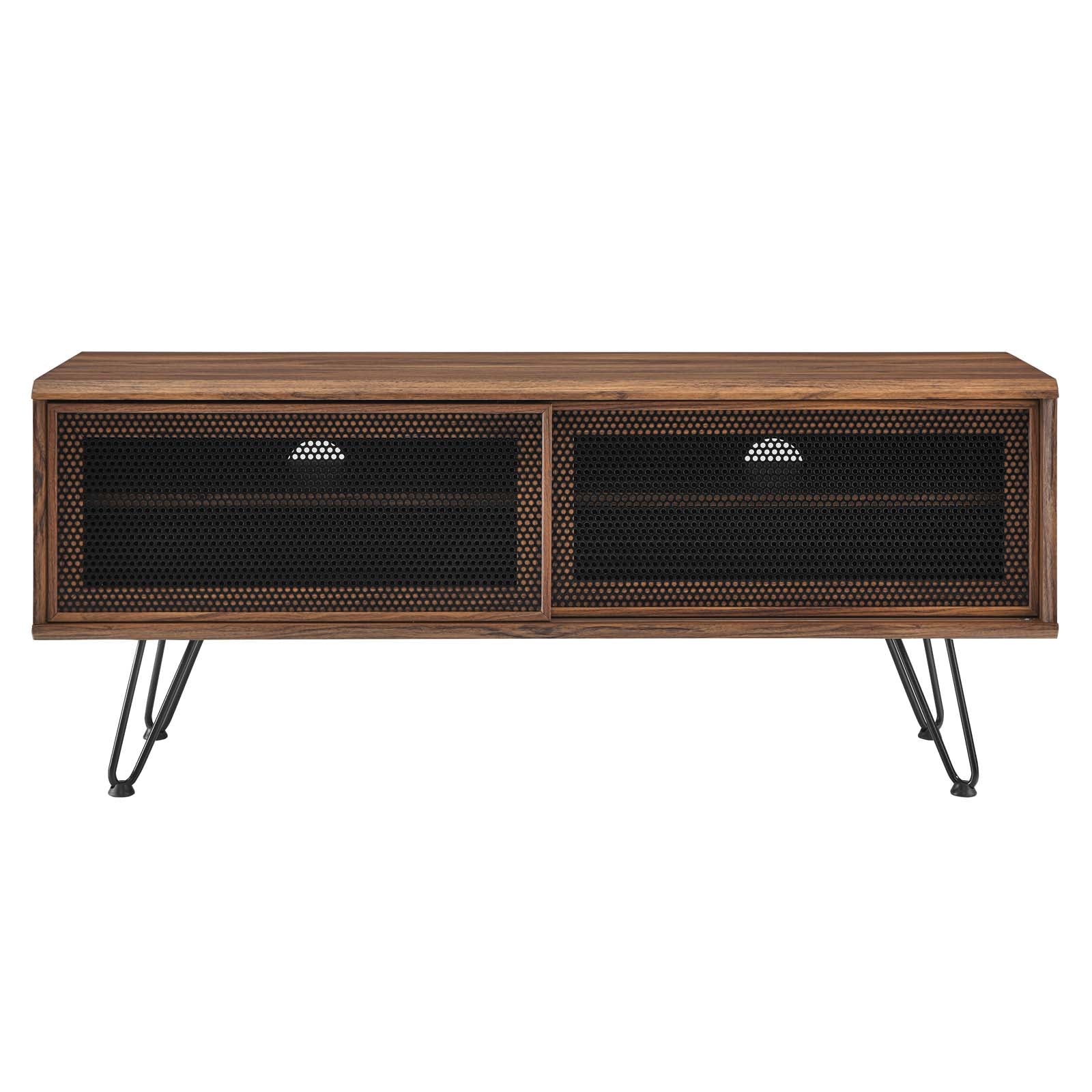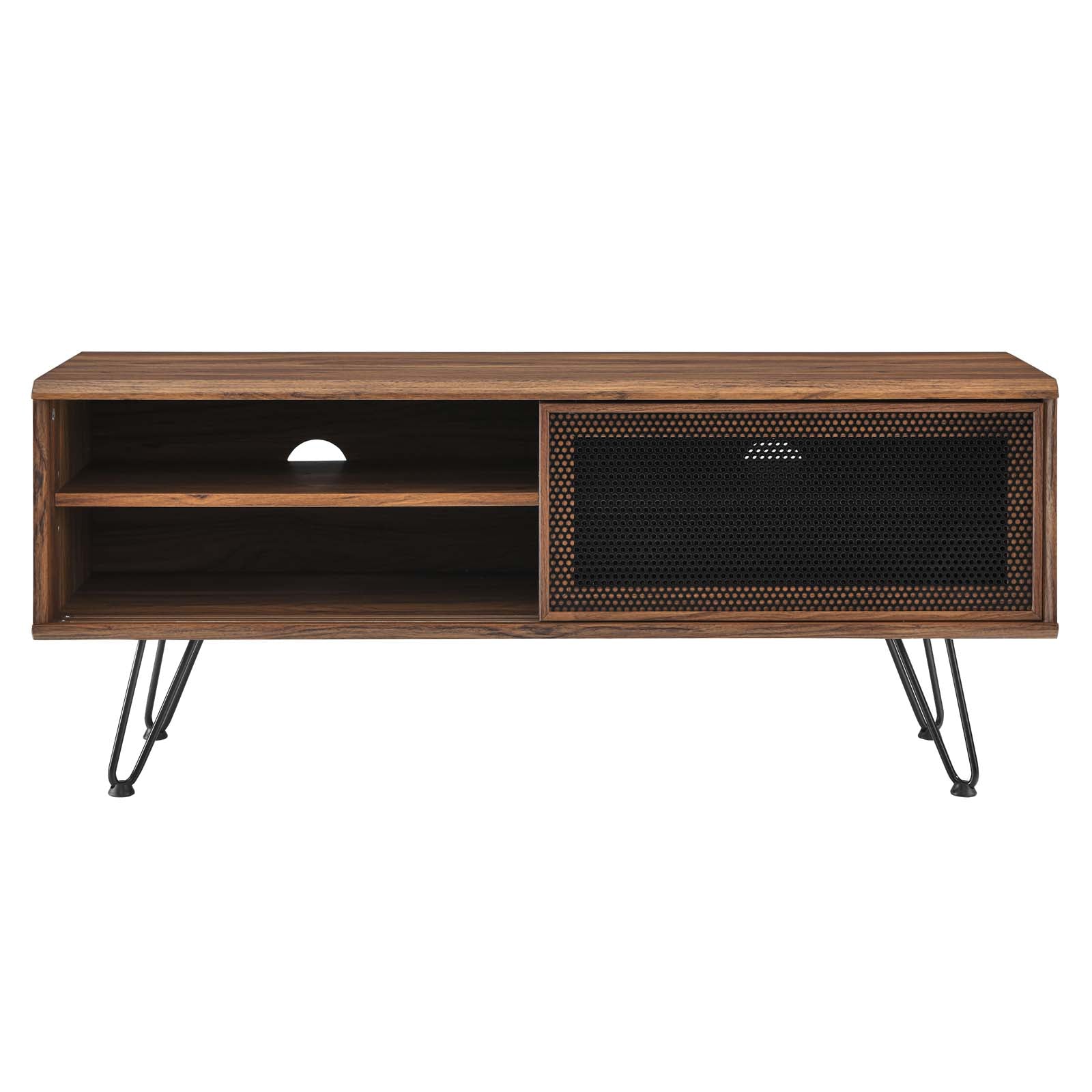 • Bullets: Industrial Modern TV Stand Sliding Mesh Doors Honeycomb Core Wood Grain Laminate Hairpin Legs Non-Marking Rubber Pads Weight Capacity: 200 lbs.