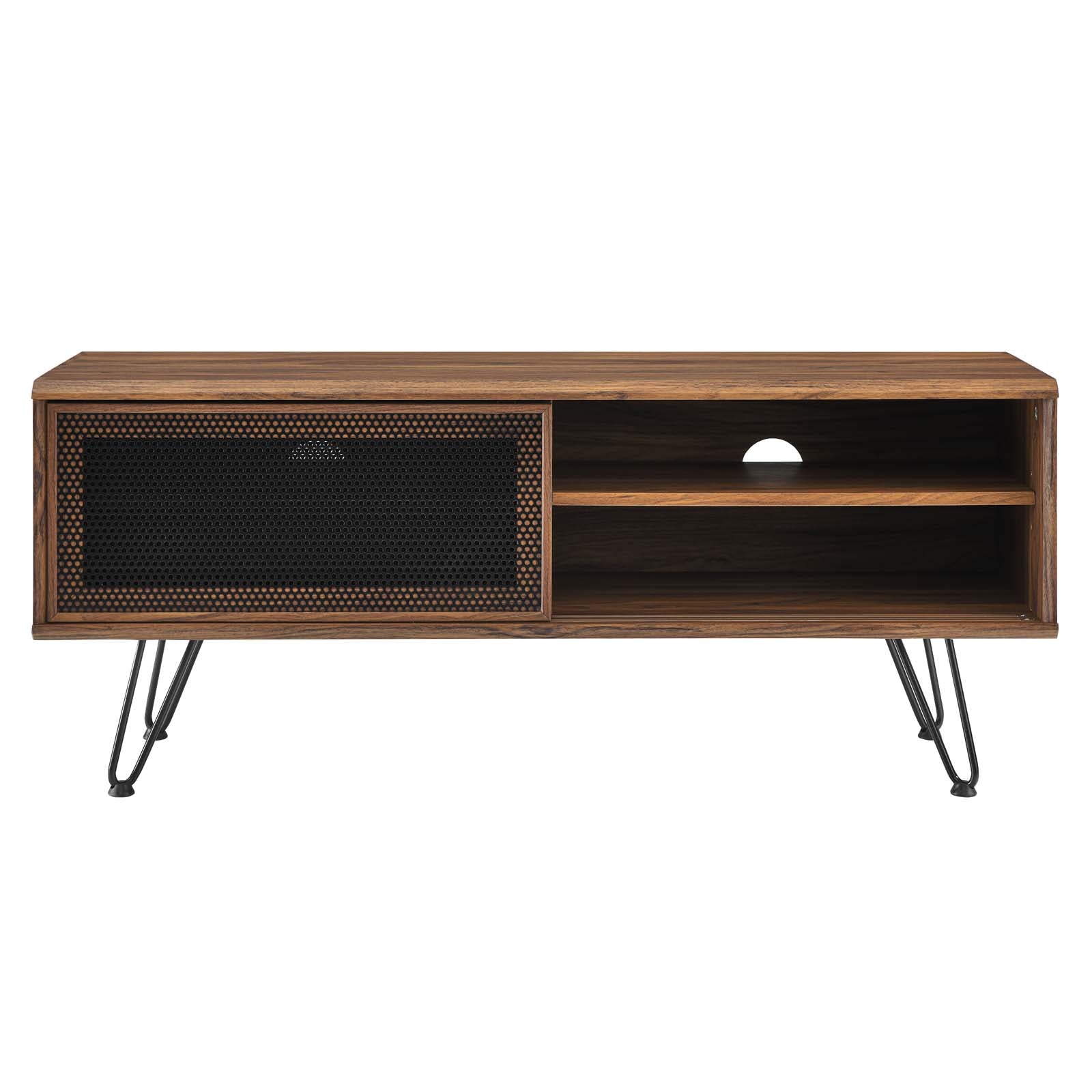 Urbanize your living space with the modern style of the Nomad 47" TV Stand. Featuring two sliding metal mesh doors, this entertainment center brings organic aesthetics and industrial design to the living room, bedroom, home office, or lounge area. This media stand is crafted with a honeycomb core and wood grain laminate. Resting on splayed hairpin legs with non-marking rubber pads, this media stand offers ample storage space for all your media essentials with spacious shelving while cable management holes keep visual space clean and allow for flow-through ventilation. This TV center accommodates TVs up to 52". Assembly required. Weight Capacity: 200 lbs. Set Includes: One - TV Stand
