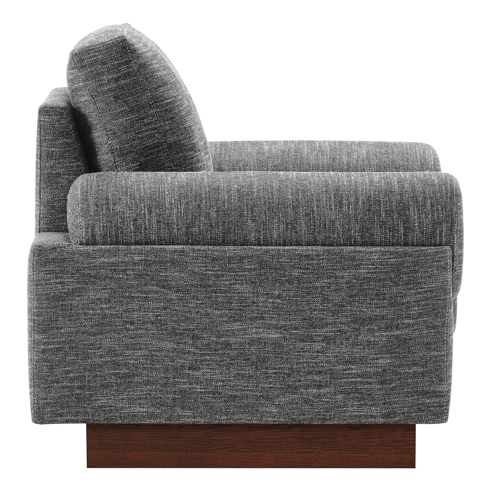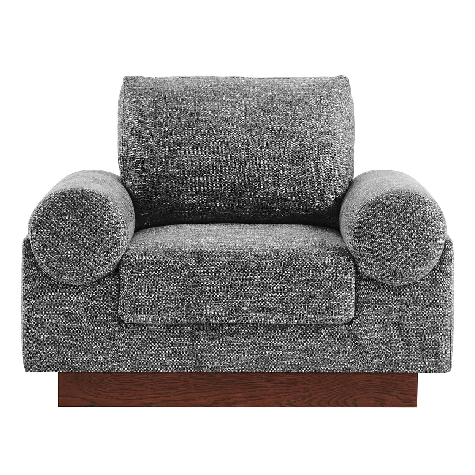 Experience contemporary luxury with the Oasis Fabric Upholstered Armchair infusing modern design and a streamlined silhouette into your living room, lounge area, or office. Showcasing a deep, cozy seat, this comfortable living room armchair offers unparalleled relaxation with armrests that resemble oversized bolster pillows. The dense foam padded cushions with pocket springs provide premium support, while the sinuous spring support system ensures lasting durability. Covered in stain-resistant polyester fabric, this upholstered accent chair exudes elegance while resting on a sturdy wood veneer plinth base. Assembly is a breeze, allowing you to effortlessly incorporate this luxurious accent chair into your home. Enhance your living space with this modern armchair that harmonizes comfort, style, and convenience. Weight Capacity: 200 lbs. Set Includes: One - Oasis Upholstered Armchair