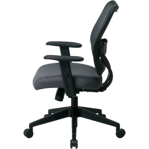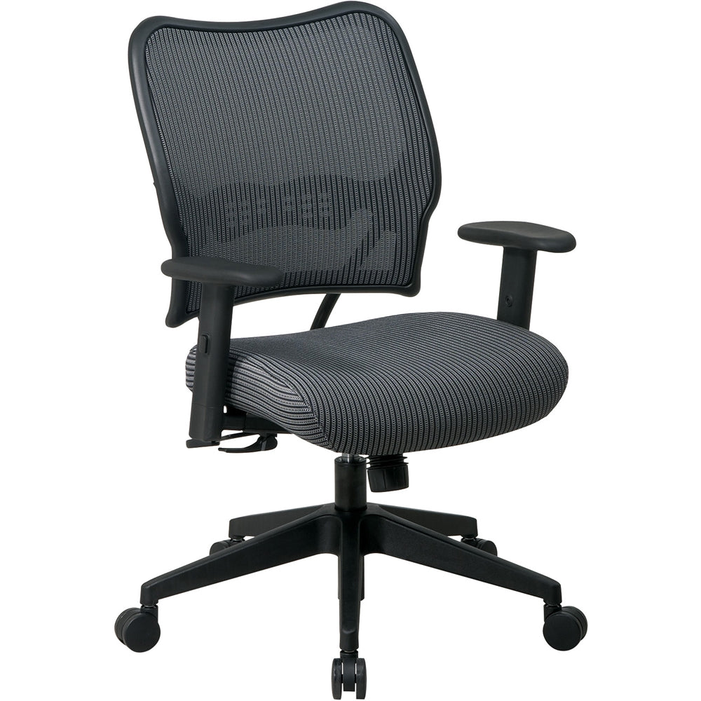Professional chair features built-in lumbar support, arms that adjust in height and width and a VeraFlex breathable fabric back with matching VeraFlex fabric seat. Functions include one-touch pneumatic seat-height adjustment, synchronized knee tilt and integral lumbar. Heavy-duty nylon, five-star base has oversized dual-wheel casters. Seat size is 19-1/2" wide x 20" deep x 4" high. Back measures 20" wide x 19" high. Distance between arms is 18-1/4".