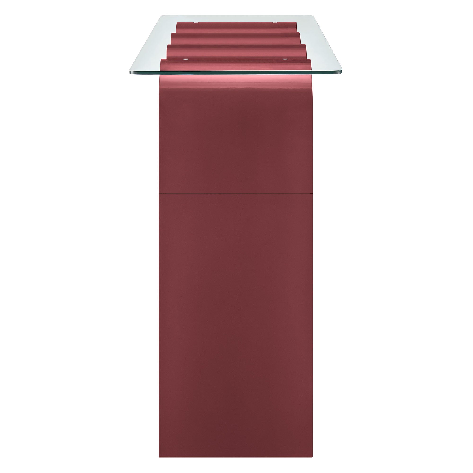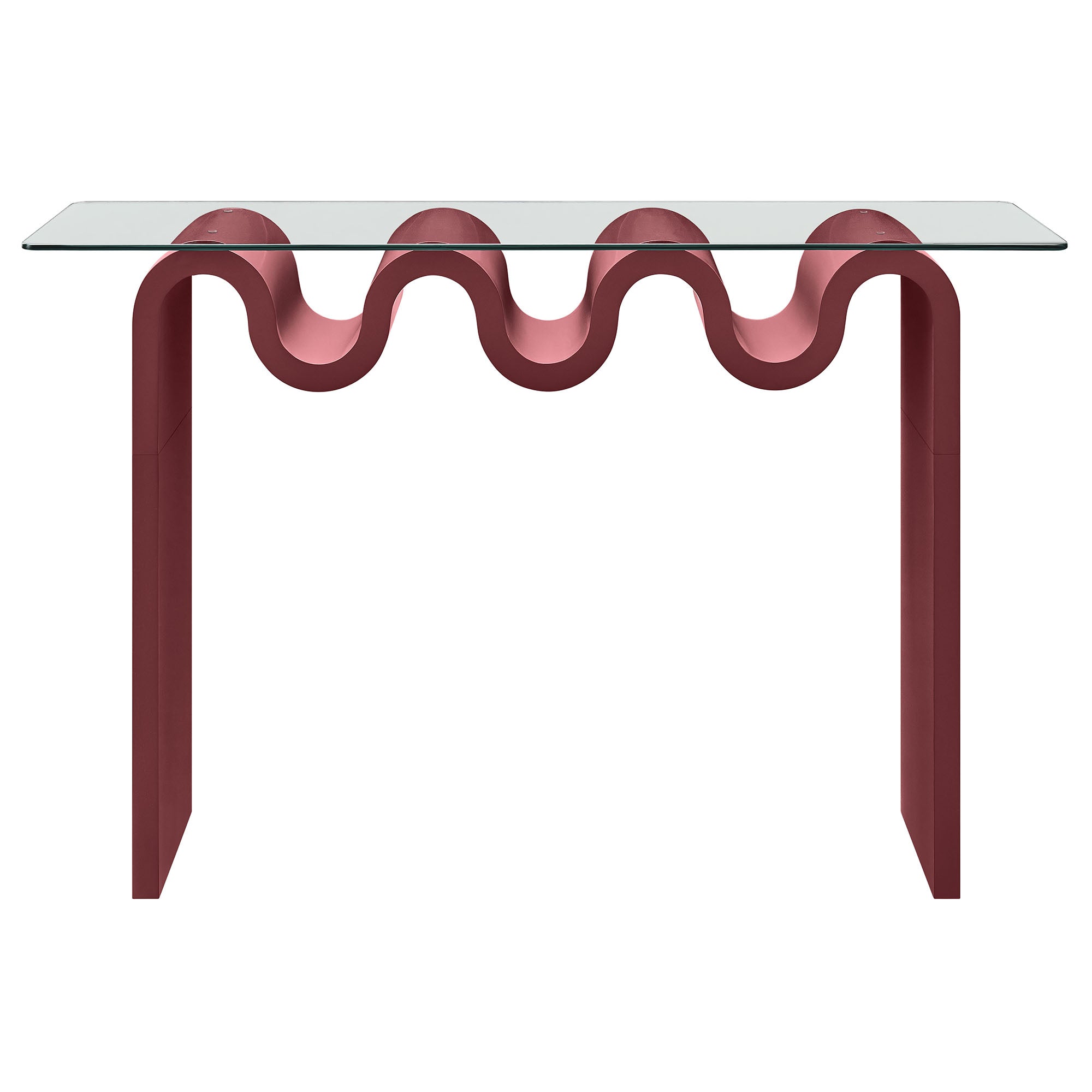 The Ondine Glass Console Table stands out with its unique retro design, adding an artistic touch to any space. Its trendy frame, shaped in a bold wave-like form across the top, is crafted from durable materials and finished with a natural ash veneer, providing a rich, textured look, or a solid color finish to add some flair to your space. The squiggle-shaped foundation of this curved console table brings a sense of movement and fluidity, beautifully contrasted by the clear tempered glass top above it. The glass surface allows the wavy base to remain fully visible, making it the focal point of the design. The rounded edges on this glass top console table add softness to the overall aesthetic, while the clear plastic anti-skid grips offer stability to ensure the glass is secure. The Ondine 50 inch narrow console table is equipped with leveling, non-marking feet that keep the clear console table securely in place without damaging your floors. Whether used as a glass entryway table, sofa console table, or even as a sleek accent piece in a home office, this funky console table serves as a conversation piece and complements both contemporary and vintage-inspired decor. Glass Accent Console Weight Capacity: 154 lbs. One - Ondine Console Table