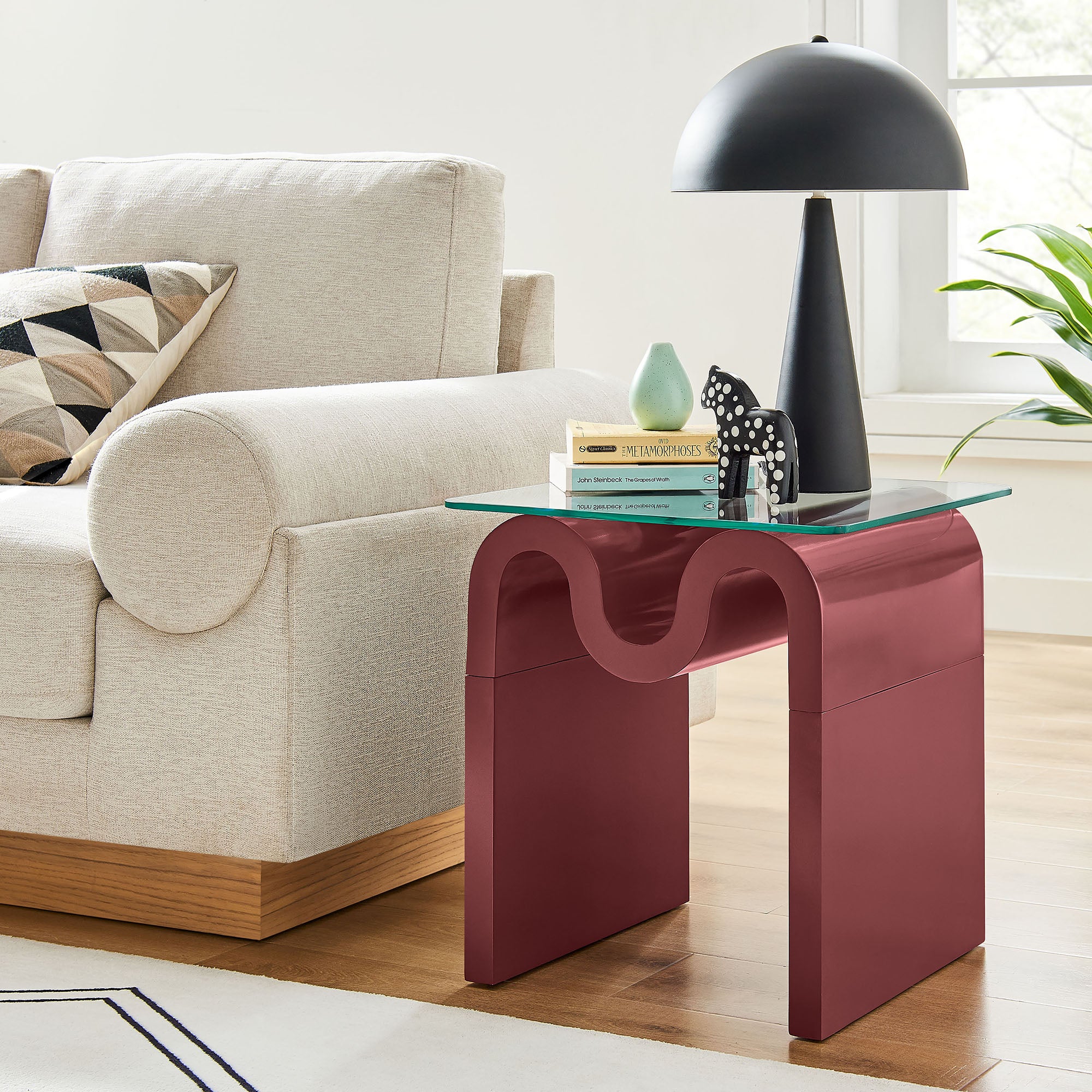 The Ondine Glass Top Side Table stands out with its unique retro design, adding an artistic touch to any space. Its trendy frame, shaped in a bold wave-like form across the top, is crafted from durable materials and finished with a natural ash veneer, providing a rich, textured look or a solid color finish to add some flair to your space. The squiggle-shaped foundation of this minimalist end table brings a sense of movement and fluidity, beautifully contrasted by the clear tempered glass top above it. The glass surface allows the wavy base to remain fully visible, making it the focal point of the design. The rounded edges on this glass side table adds softness to the overall aesthetic, while the clear plastic anti-skid grips offer stability to ensure the glass is secure. The Ondine square accent table is equipped with leveling, non-marking feet that keep the clear side table securely in place without damaging your floors. Whether used as a small drink table in the living room, a plant stand or a boho glass nightstand, this vintage style side table serves as a conversation piece and complements both contemporary and vintage-inspired decor. Glass Accent Side Table Weight Capacity: 88 lbs. One - Ondine Side Table