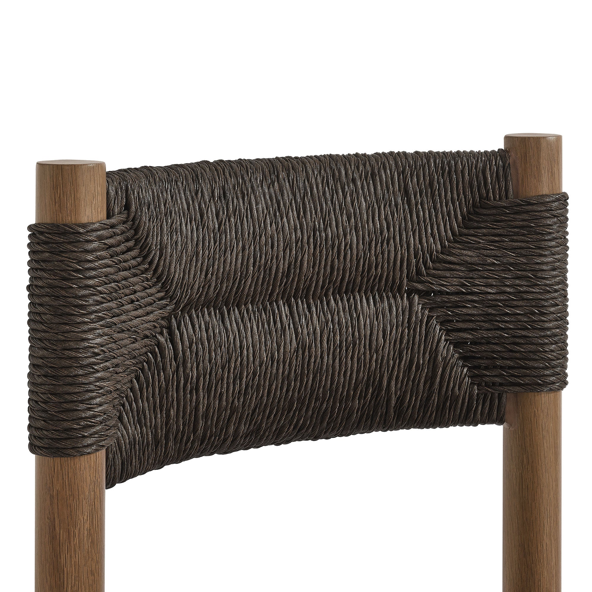 • Bullets: Set of 2 Outdoor Dining Side Chairs Synthetic Rattan Backrest and Seat Aluminum Frame with Wood Finish All-Weather Design Non-Marking Floor Glides Fully Assembled
