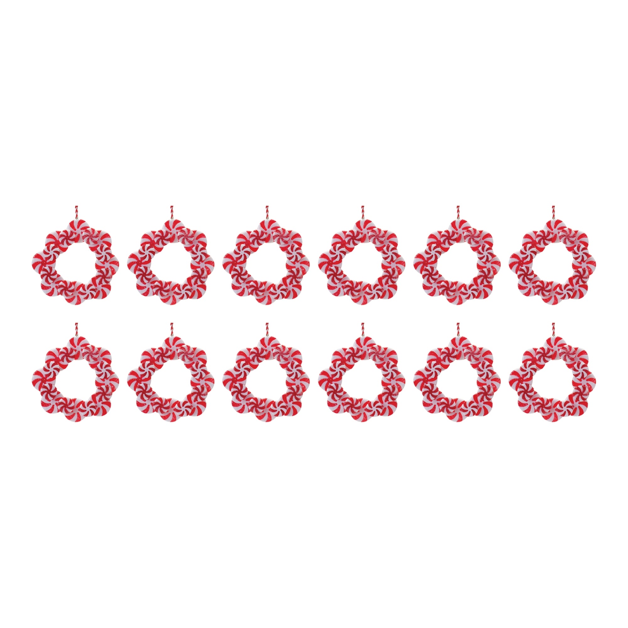 Add a sweet touch to your Christmas Tree with this beautiful set of Glass Peppermint Candy Wreath Ornaments. Featuring 12 pieces, this set's festive red and white tones, whimsical peppermint wreath design, and glitter frosted finish are the perfect combination to create a memorable display. The quality glass composition with delicate string hanger is sure to endure for seasons to come. Whether you're adding a touch of cheer to your home or gifting to a loved one, these ornaments will definitely bring smiles to your home. , Candy Wreath Ornament (Set of 12) 5"D Glass