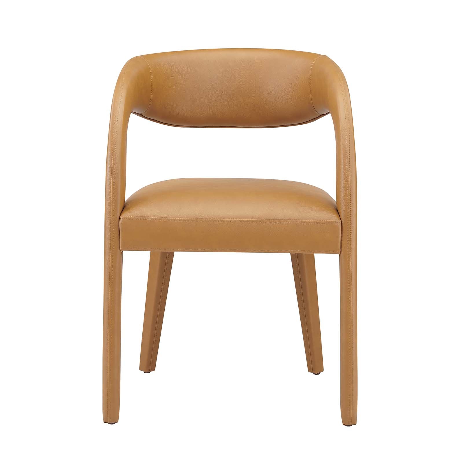 Experience the perfect blend of modern sophistication and luxurious comfort with the Pinnacle Vegan Leather Upholstered Dining Chair Set of Two. The distinct silhouette showcases a curved backrest and an open design that effortlessly enhances your dining or living space with luxe style. This dining chair set indulges your senses with its dense foam padding, upholstered in a smooth, quality vegan leather. Non-marking plastic foot pins ensure your flooring remains free from scuffs and scratches. With minimal assembly needed, this set not only offers a stylish statement but also a hassle-free setup. Weight Capacity: 330 lbs. Set Includes: Two - Dining Chair