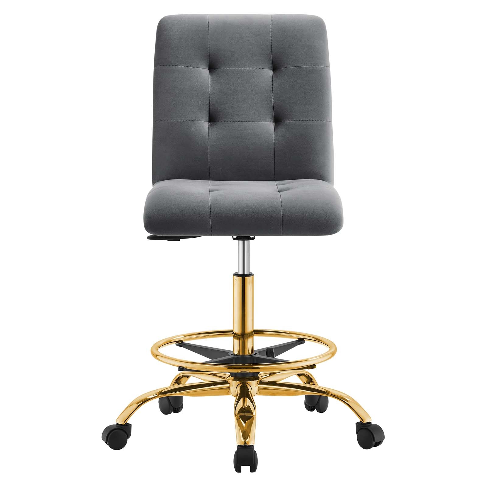 Etiquette presides over the properly styled Prim Armless Drafting Chair. Modern and luxurious, this swivel drafting stool features deep biscuit tufting, stain-resistant performance velvet upholstery, and elegant piped trim for added finesse. This velvet drafting-height office chair is height adjustable, features a 360¼ swivel, and comes outfitted with a gold metal base with five dual-wheel nylon casters. Perfect for standing desks, drafting tables, reception desks, and more, Prim is complete with dense foam padding for lasting comfort throughout the workday. Assembly required. Weight Capacity: 287 lbs. Set Includes: One - Prim Armless Drafting Chair