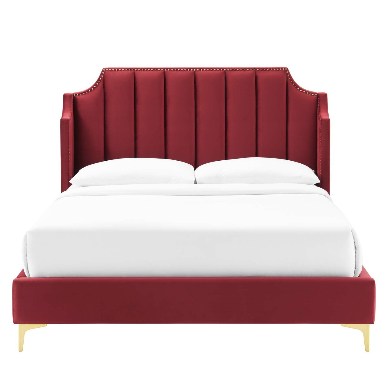 Inspire tasteful elegance and vintage modernity in a master bedroom or guest bedroom with the Daniella Performance Velvet Queen Platform Bed. This tufted bed brings a glam deco presence to your bedroom with its channel tufting, nailhead trim, and unique wingback design. The padded queen headboard and side rails come covered in soft, stain-resistant performance velvet upholstery that grants rich texture to the luxurious design and a supportive place to rest while sitting up and relaxing in bed. Resting atop gold metal legs, this platform bed frame, crafted with MDF, plywood, and LVL, is a sturdy mattress foundation for memory foam, innerspring, latex, and hybrid mattresses. With supporting legs and a reinforced center beam, this upholstered bed is complete with a poplar wood slat support system that offers lasting stability and healthy air circulation. Assembly required. Queen Bed Weight Capacity: 800 lbs.