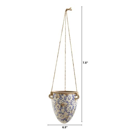 A modern take on the classic print pattern, house your fauxbolous arrangement in this floral design hanging planter. The traditional ceramic vase has a homey, cozy feel that is perfect for rustic, transitional and farmhouse inspired spaces. The rope is 2’ high and you can customize for your space. No drainage holes and indoor use only.
