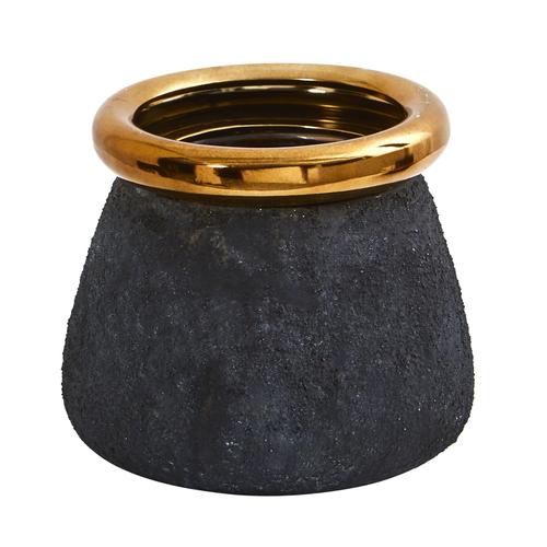 Enhance your home with this Rough Textured Matte Black Vase with Bronze Rim. Trendy and in style, the black matte is accented by the bronze rim and brings a mid-century vibe to all spaces. Reaching 10” wide, DIY your dream arrangement, house some hydrangea, loose twigs, or branches for a modern look.