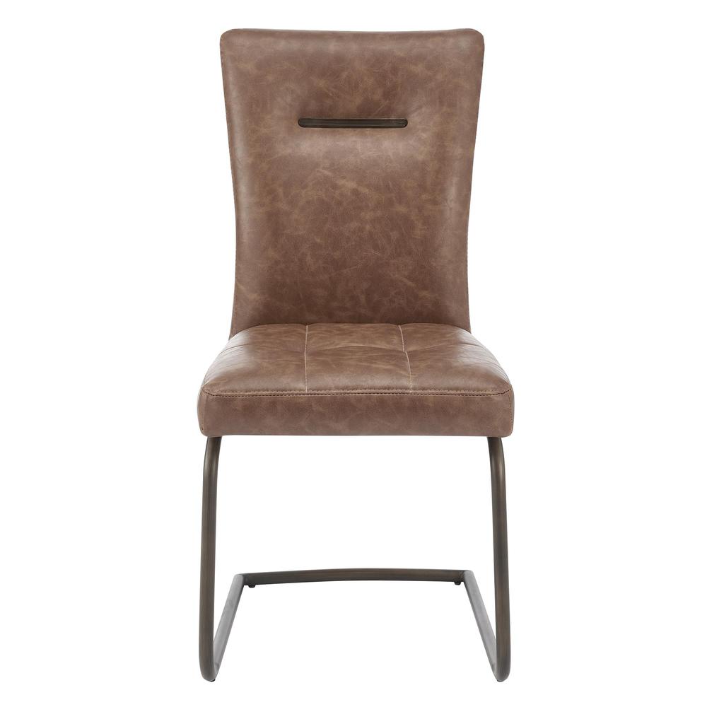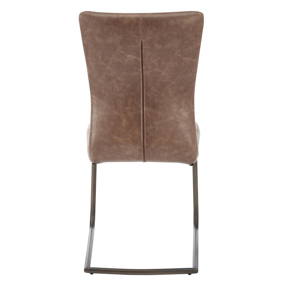 For the ultimate Urban Modern for the dining and home office space, opt for Mauricia chair. Its sleek profile is punctuated by faux leather cover and design details that include steel accent line on the back rest and biscuit tufting on the seat cushion. Cantilevered legs in polished silver completes the modern appeal. Easy assembly. Available in Antique Graphite Gray and Antique Cigar Brown. Set of 2.