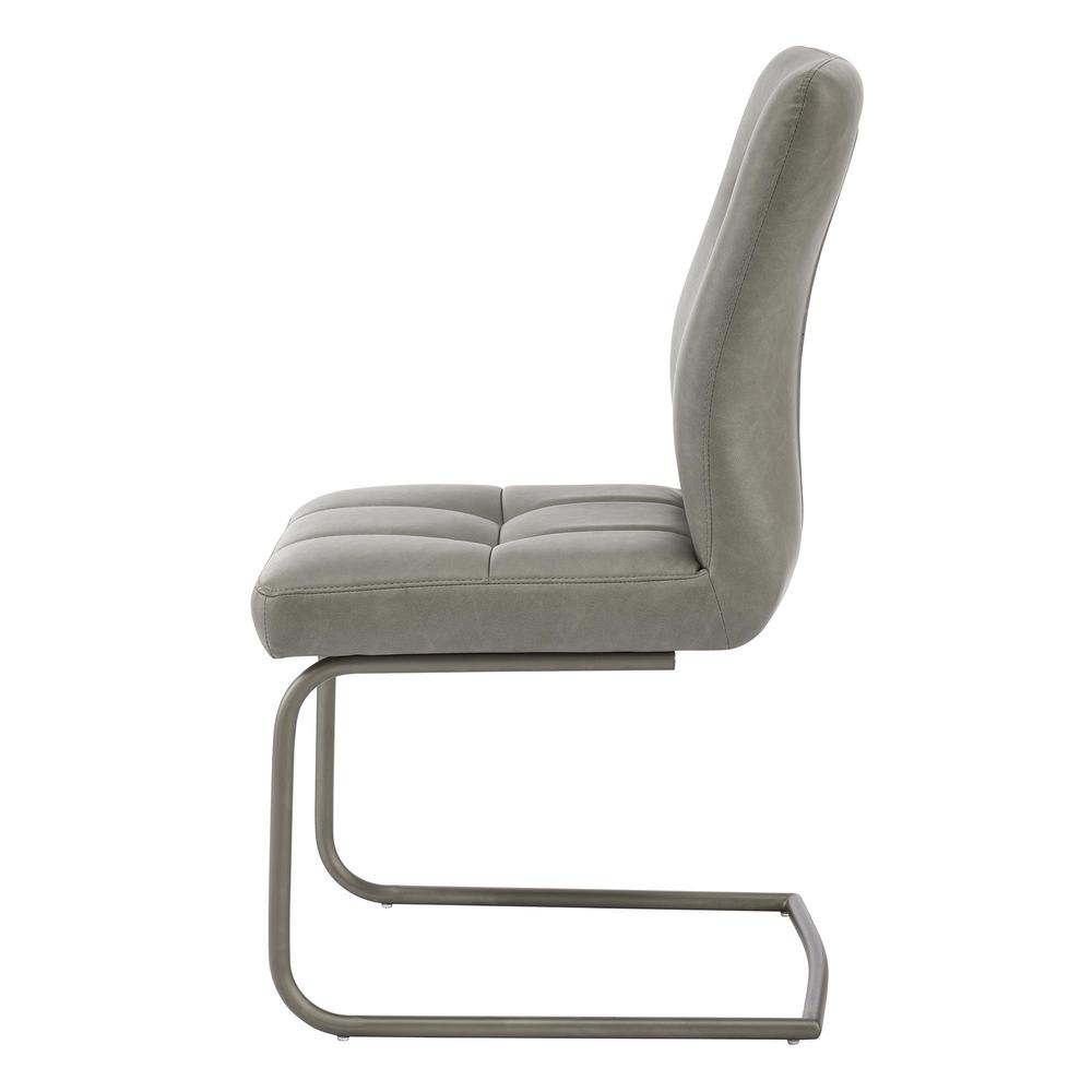 For the ultimate Urban Modern for the dining and home office space, opt for Mauricia chair. Its sleek profile is punctuated by faux leather cover and design details that include steel accent line on the back rest and biscuit tufting on the seat cushion. Cantilevered legs in polished silver completes the modern appeal. Easy assembly. Available in Antique Graphite Gray and Antique Cigar Brown. Set of 2.