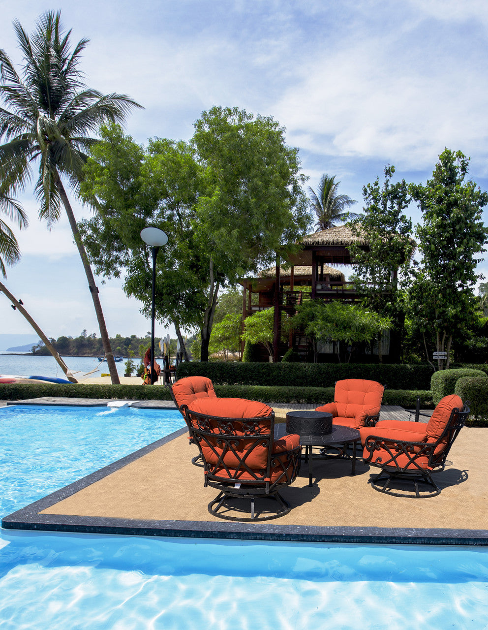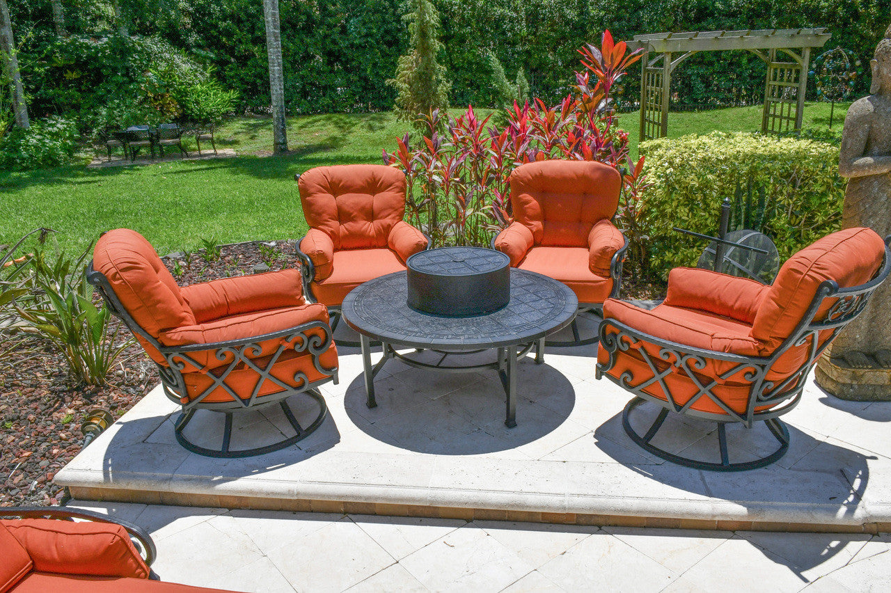 Bridgeton Moore presents the Ultimate Outdoor Firepit Chillounger All Inclusive Club Chair Set, a set that embraces the social trend of high end super casual outdoor furniture. Actually our Chillounger set takes casual outdoor entertaining groups to the next level. WARNING These are the Ultimate for plush deep seating comfort. Our Chilloungers offer the ultimate casual comfort. You cant just sit, you climb in, curl up and relax into your soon to be favorite super plush, super deep, super wide comfortable Chillounger swivel chairs. The set includes 4 substantial Chillounger Swivel Club Chairs and a matching and patented Bridgeton Moore All-Inclusive Party Table. The provided all-inclusive table, fire pit and accessory package enables the table to become a wood burning fire pit or a barbecue grill and also includes an ice bucket which fits into the center of the table and can be used with or without the fire pit and stores under the table in a specially designed holder when using the other fire pit table options. The Chillounger offers a beautiful bent ,forged and hand hammered scroll design that is finished in a rich brown bronzed tone with hand highlights that accent the details. The chairs are fully constructed, meaning they are fully welded prior to finishing, the best process to insure long lasting heavy duty stability and simply require assembly of the fully constructed seat portion to the fully constructed swivel base, the table requires some assembly. The cushions are special quick drying foam and covered in a beautiful contrasting Terra Firma Sumbrella Brand fabric, considered amongst the best fabric for long lasting outdoor use in the industry. The chair, table and decorative fire pit ring are constructed in 100% aluminum that will never rust with a long lasting powder coat finish. The table can be used with or without the included Fire Pit and Accessory Package and owners often like this flexibility enabling them to also use the table as a conventional umbrella table or table with the Ice bin only. The well thought through design enables owners to store these extra items away, keeping them clean and ready for use on those special times when they will enhance your use of all that this set offers. The provided accessory package includes 1) a decorative fire pit ring which fits into the center of the table 2) An Iron fire pit 3) A safety net 4) An aerator for inside the fire pit which allows for better burning 5) a grease trap which attaches under the pit to catch drippings 6) A barbecue grill grid designed to sit on top of the fire pit 7) A decorative stand to neatly store all accessories when not in use and 8) A wood and iron handled tool for removing accessories when hot. Bridgeton Moore has established high brand quality standards and offers one of the best warranties in the Industry, 3 years on all frames and finish under normal conditions, fabrics are all Sumbrella grade and come with a manufacturers supplied two years against any manufacturing defects and or fading from date of purchase. Note: All products used outdoors require reasonable care and that level of care depends on varying external conditions. Covers are recommended for year round outdoor exposure and especially for all coastal applications. Extended exposure in coastal areas can cause corrosion and while this product is used in many coastal applications, they are voided from warranty. Simple hosing down or rinsing off salt exposure if any will protect and extend the beautiful finish. The fabrics can be easily cleaned in a variety of ways and Sumbrella fabrics are so colorfast they can withstand even the use of bleach. Note : Do not allow water to sit inside your fire pit when not in use as it is iron and will create premature and unnecessary exposure to rusting and will void any warranty. Replacement parts can be purchased. Catalog:GF-LD2012ABF-52 Set Includes: Sku: 12003437 Chillounger Accessory Base Stand Qty 1 Sku: 11178613 Firepit w Accessories Qty 1 Sku: 11170128 Chillounger Round Table 52 inch Qty 1 52.00 x 52.00 x 20.00 Sku: 10635042 Table Basin Qty 1 Sku: 11170110 Chillounger Swivel Chair Qty 4