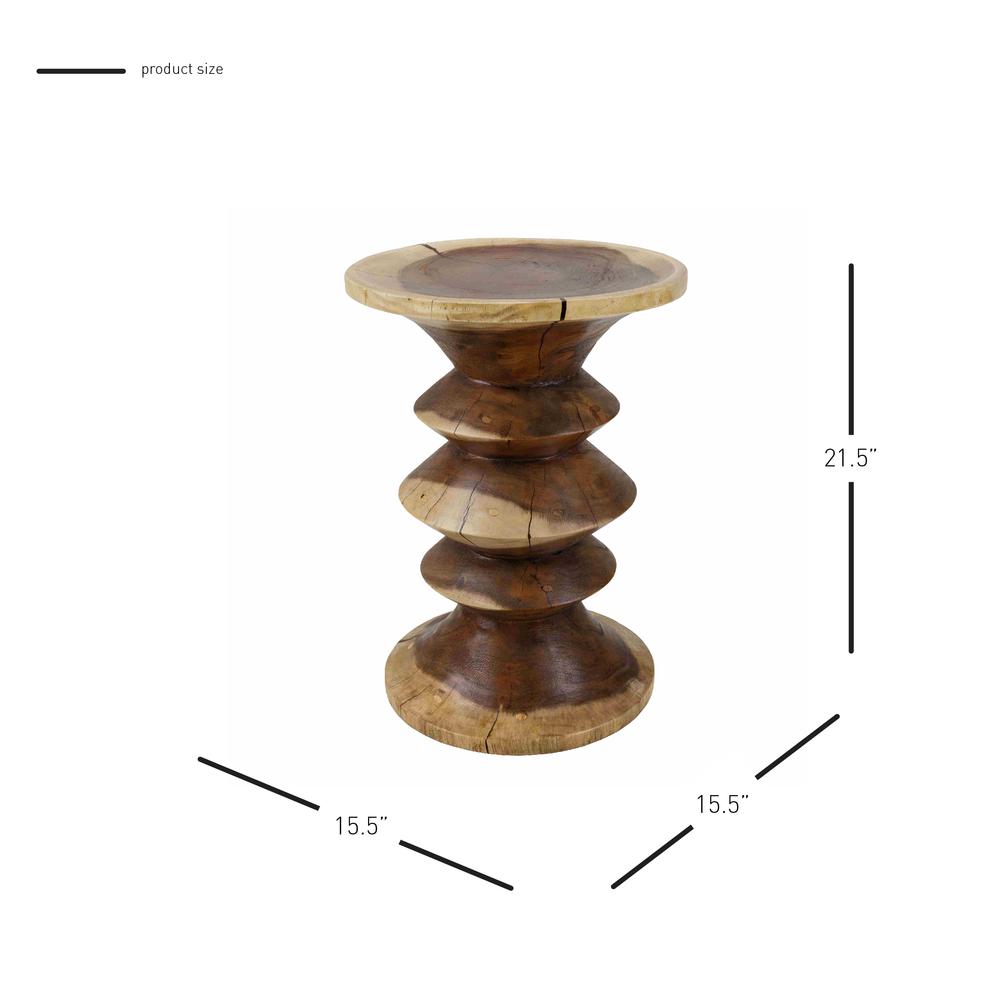 Distinctive in Modern Contemporary vibe, the Ziva Side/End Table is made from solid Trembesi wood. Gorgeous in two-tone natural color with spiraling ridges and cylindrical shape. All of the woodÕs characteristics like knots, holes and small fissures serve to make the piece unique. Fully Assembled. Available in Natural and Black.