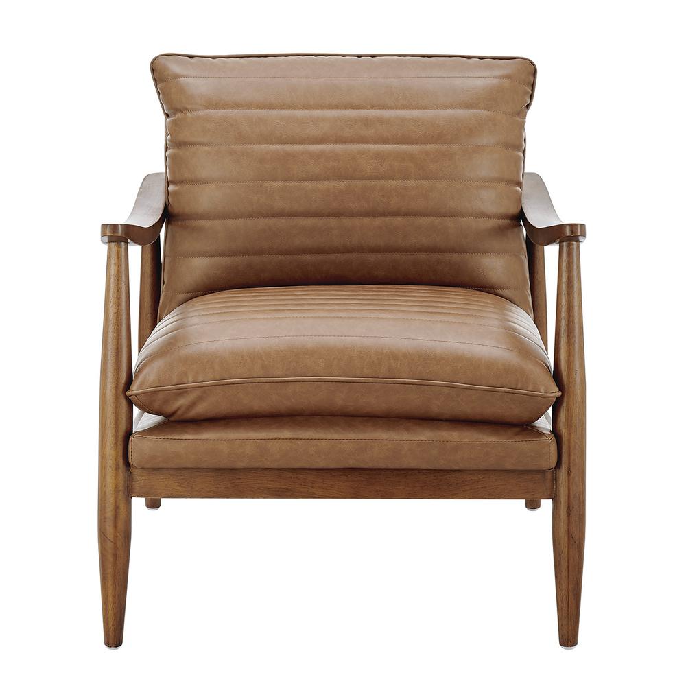 Refreshed Mid-Century Appeal - its timeless aesthetic is always in fashion! The latest arm chair highlights angular shape arms, channel tufted plush cushions, vintage effects faux leather upholstery in matching solid wood legs. Available in Vintage Cider.