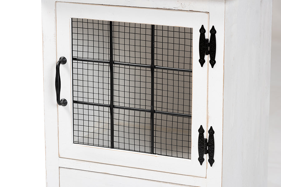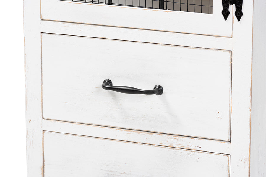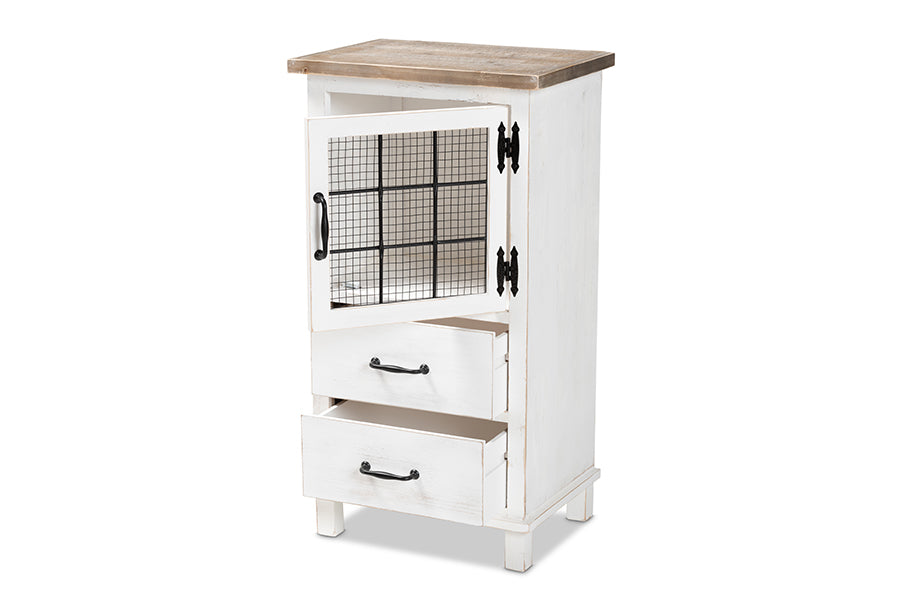 Organization is made easy with the charming Faron cabinet. Made in China, the Faron is comprised of a sturdy wood frame featuring a lightly weathered two-tone white and oak brown finish for an aged, vintage look. Two drawers and one compartment behind the door provide ample storage space to assist in organizing busy areas. Fully assembled, the Faron is adorned with antique inspired, black finished metal accents for a cool, industrial touch. A fantastic assistant to the modern household, the Faron cabinet adds value to any space.