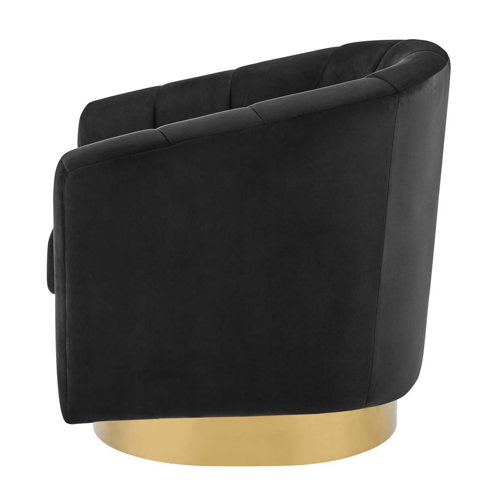 Modern Deco with 360-degree swiveling comfort is the latest Natasha accent chair. Outfitted with luxe vibe velvet cover and channel tufting backrest that's fashioned on painted gold swiveling base. Fully Assembled. Available in Alamo Black and Shearling Beige. FSC Certified.