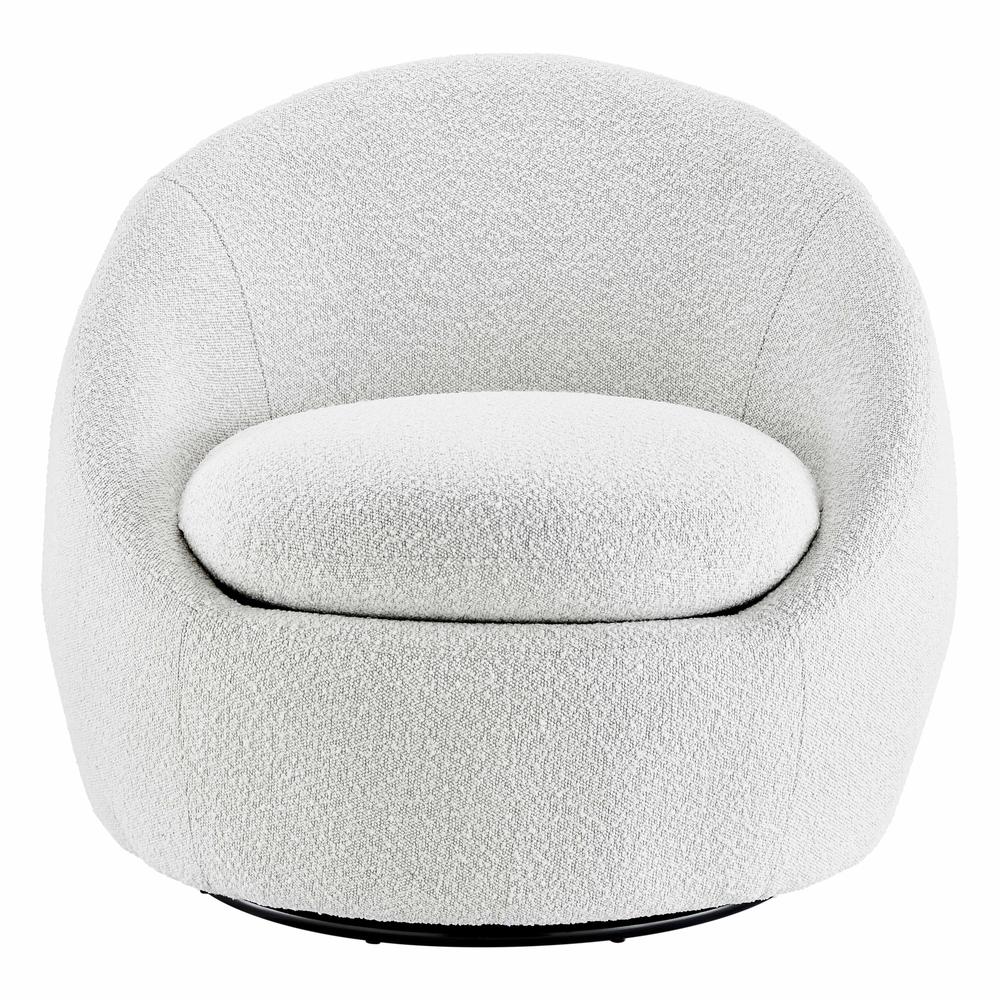 A Modernist's Dream Lounge Chair - Round Silhouettes and Sculpted Form bring chic dŽcor for the space. Cozy for lounging and entertaining as it swivels for convenience. The soft boucle fabric is easy to care for and in monochrome tone that goes well for many interiors. Fully Assembled. Available in Boucle Beige and Cardiff Gray.