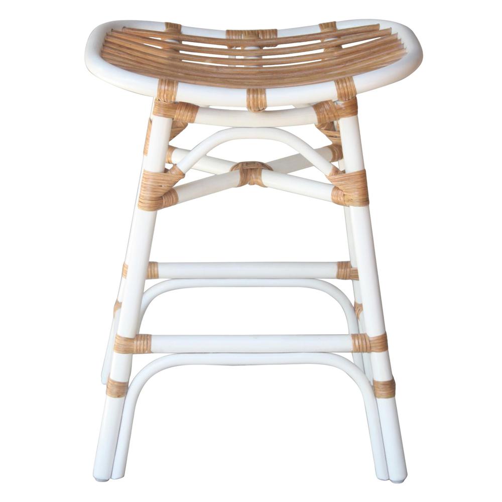 Boho-Chic in 24" seat height counter stool an all-time favorite! The gently curving saddle seat sits atop thick bent rattan frame for style and sturdiness. Fully assembled, available in Canary Brown, White and Black frame. Joints are wrapped in Brown tone rattan peel binding for an appealing contrast.