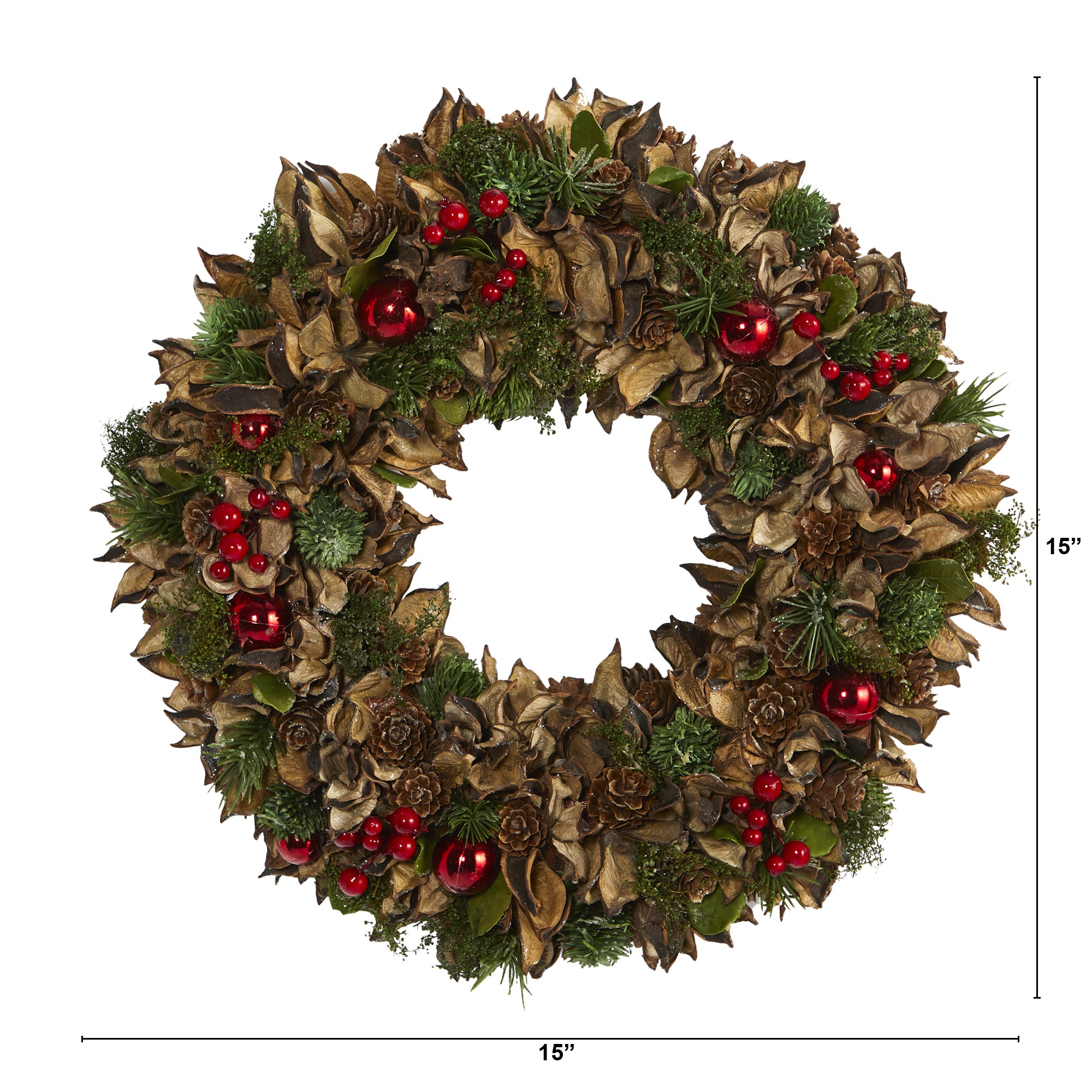 Nearly Natural 15" Holiday Artificial Wreath with Pine Cones and Ornaments
