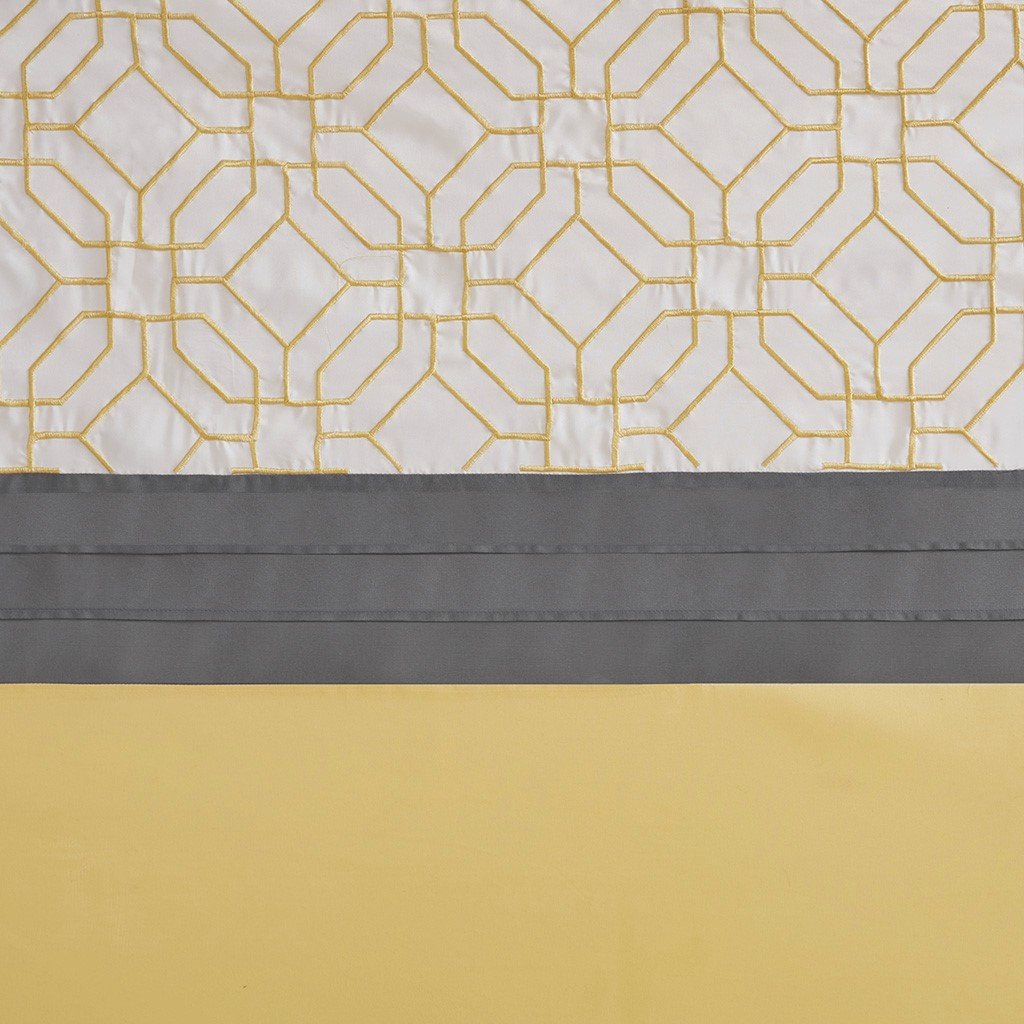 The 510 Design Donnell Embroidered and Pieced Shower Curtain offers a fresh update to your bathroom. A pintucked and pieced design is featured in grey and yellow hues, for a simple updated look to your decor. An embroidered geometric design adds texture and dimension, while an added lining provides better drapability and an extra layer of privacy. Made from soft microfiber, this pieced shower curtain brings a refreshing touch to your bathroom decor.