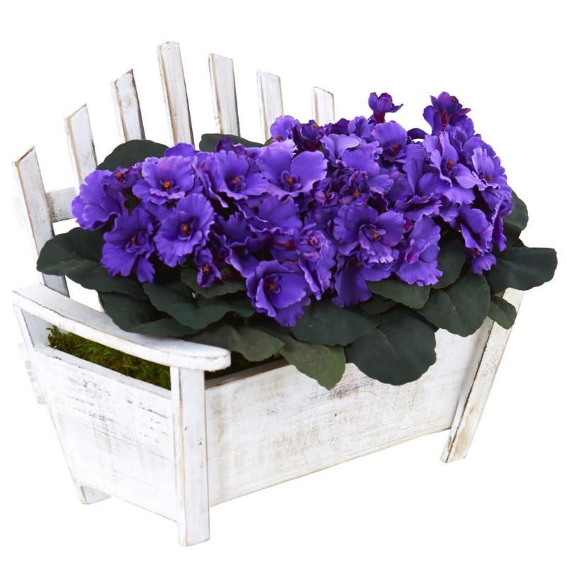 African Violet Artificial Plant in Wooden Bench Planter