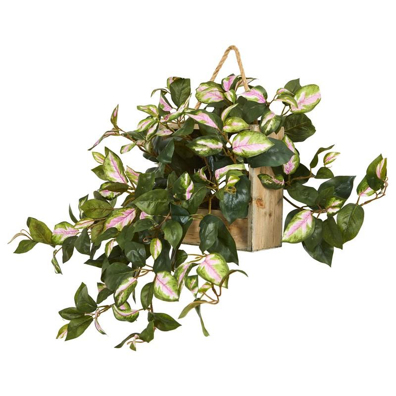 Bursting out from its own decorative hanging frame, this artificial hoya plant would look great in any room in your home. It features rich green leaves with subtle tints of pink. This piece will never outgrow its perfect arrangement and requires no maintenance. Hang it on any bland interior wall or place it near your wall decor--like photos and artwork--to bring a little touch of nature to the arrangement.