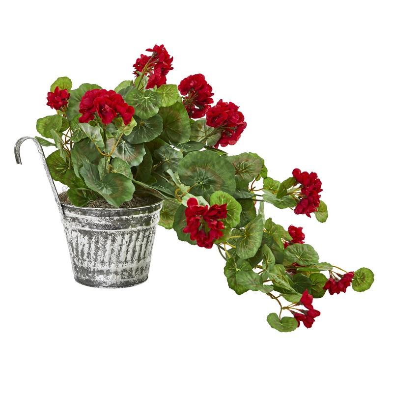 Splash some color into your home with bright colored artificial geranium plant boasting a multiple of vivid blooms nestled amidst vibrant green leaves spilling out from a vintage metal planter with a hook ready for hanging. Reaching 15” high, it would make an exceptional focal point perched on a living room table.