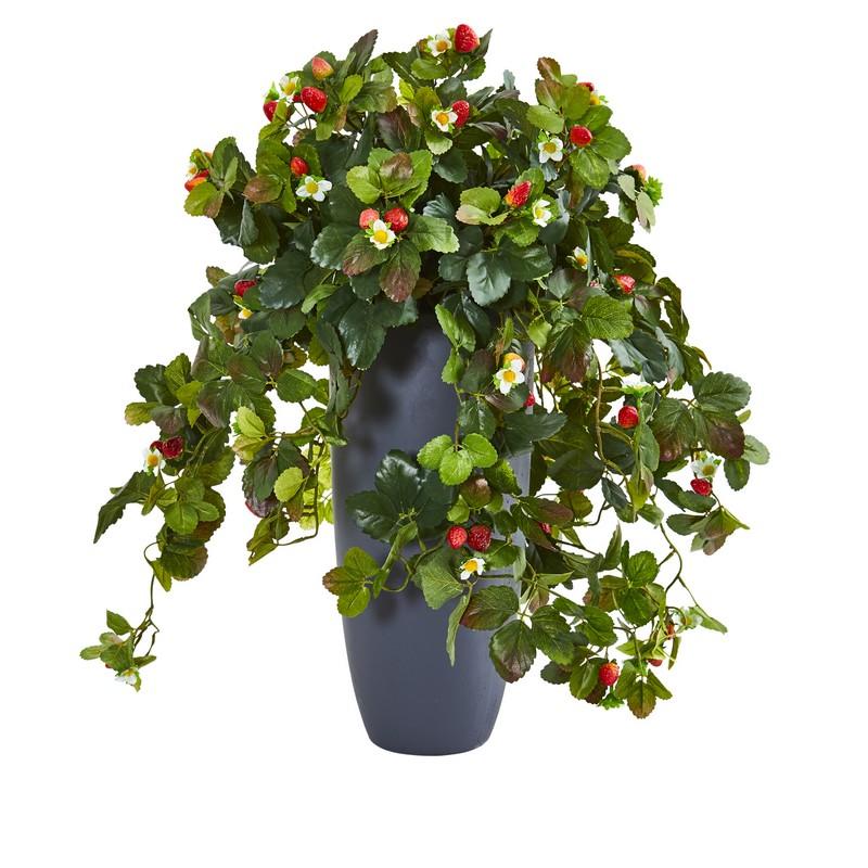 Channel the feeling of summer all year round with this artificial strawberry plant boasting an overgrowth of bright colored leaves, beautifully highlighted with realistic looking strawberries. Reaching 28” high from an accompanying gray planter, it's great for sprucing up a bare kitchen or indoor patio.