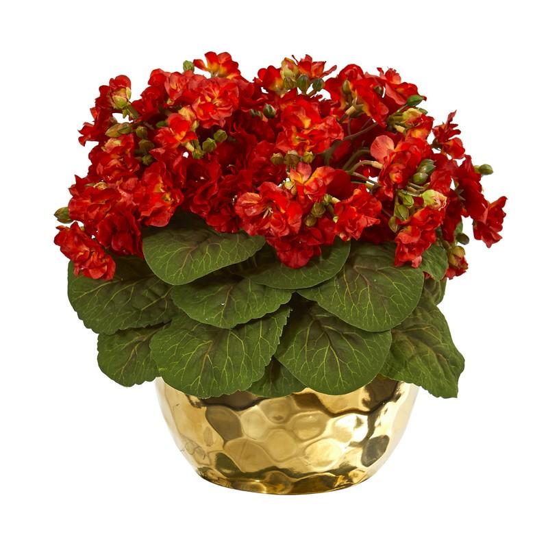 Inject cheerful coloring throughout your home interiors with artificial violets. Showcasing bright vivid hues, its delicate floral are handsomely contrasted against dark, detailed leaves popping out from underneath. Standing 11” high from a gold vase, it would beautifully complement country decor.