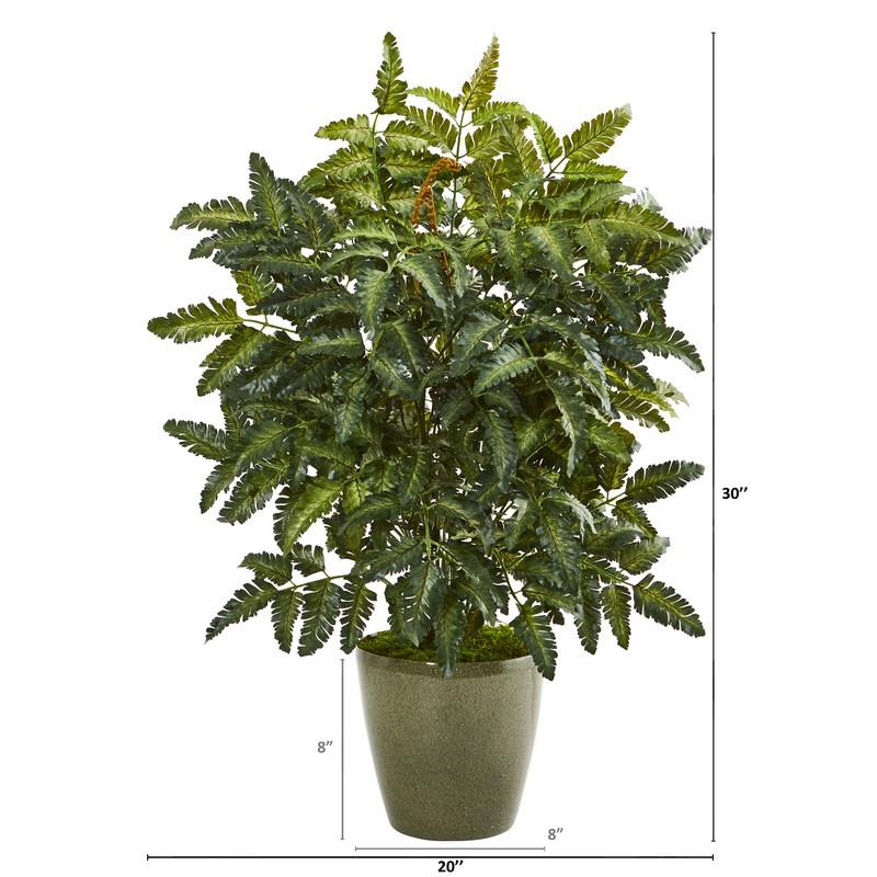 Instantly greenify your home or office with this artificial bracken fern. Designed to look as natural as the real thing, this lush textured plant boasts a collection of variegated leaves in naturally occurring hues. Reaching 30” tall from its green planter, it provides year-round greenery to bare spaces.