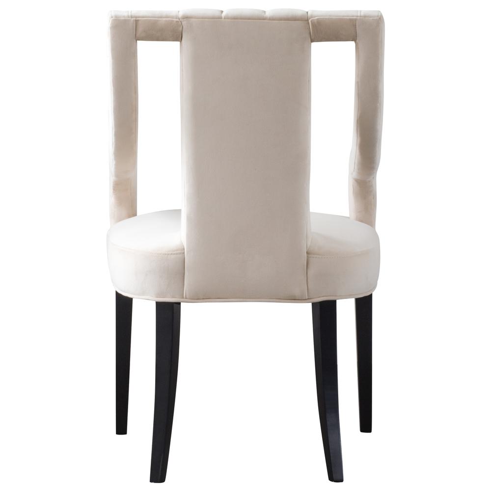 Inspired by the classic Greek design, the Viola velvet Klismos chair adds a touch of high style to a room. The gently curved open arms and channeled open back are highlighted by go-anywhere neutral Dulce Sand upholstery and Black Birch wood legs. Fully assembled.