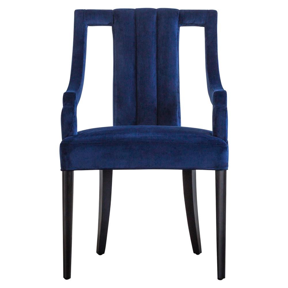 Inspired by the classic Greek design, the Viola velvet Klismos chair adds a touch of high style to a room. The gently curved open arms and channeled open back are highlighted by vibrant blue-hued velvet upholstery and Black Birch wood legs. Fully Assembled, available in other Dulce Blue and Dulce Sand.