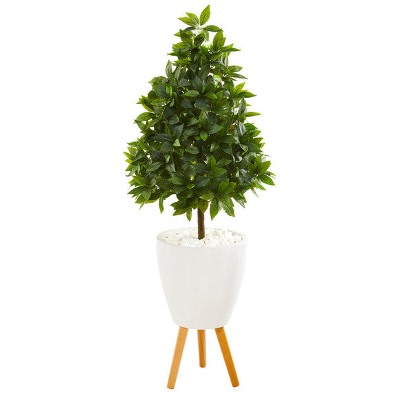 Nearly Natural 44" Sweet Bay Cone Topiary Artificial Tree in White Planter with Stand