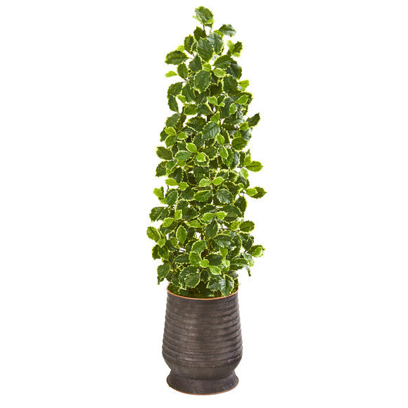 Nearly Natural 43" Variegated Holly Leaf Artificial Tree in Ribbed Metal Planter (Real Touch)