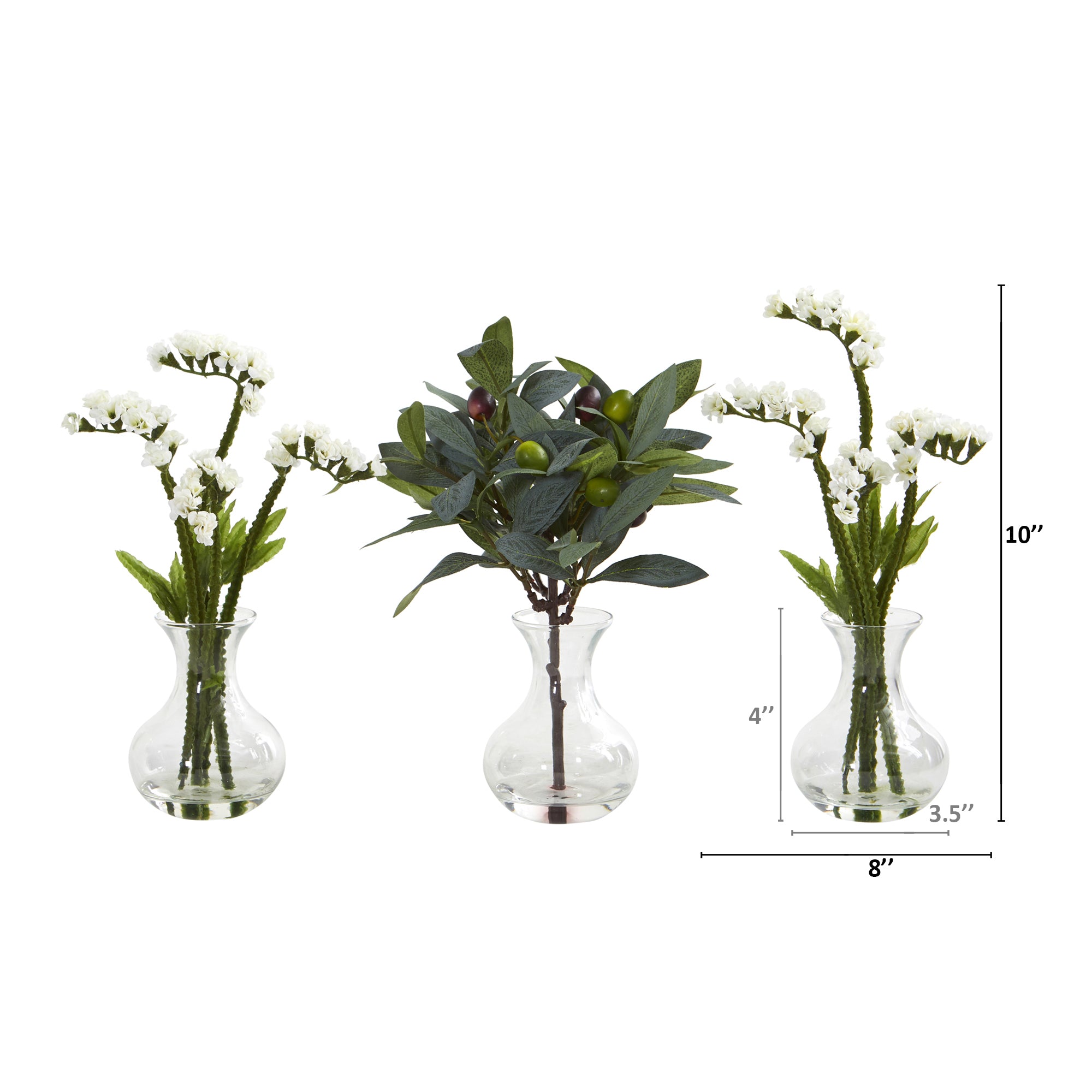 Nearly Natural 10" Baby Breath and Olive Artificial Arrangement in Vase (Set of 3)