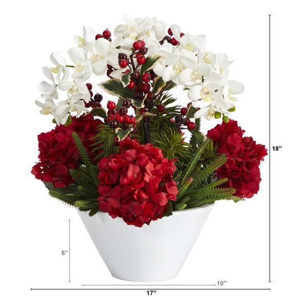 Showcase seasonal cheer throughout the winter holidays with the help of this brightly colored artificial arrangement composed of various faux succulents and mixed greens handsomely highlighted with a collection of winter favorites like phalaenopsis orchids and hydrangeas in seasonal hues. Accented throughout with complementary holly berries and foliage, this winter-inspired arrangement stands 18" high from its accompanying vase.