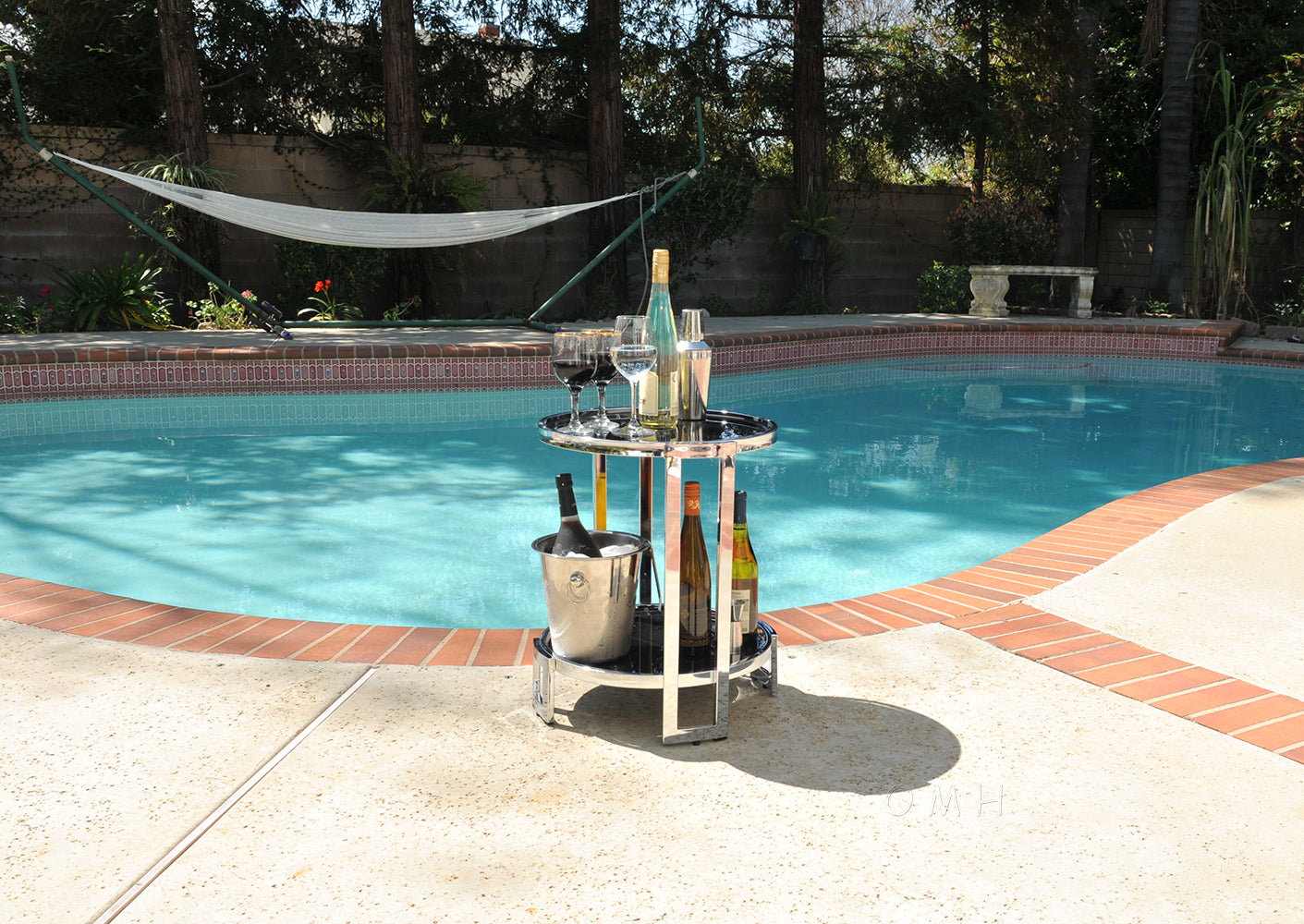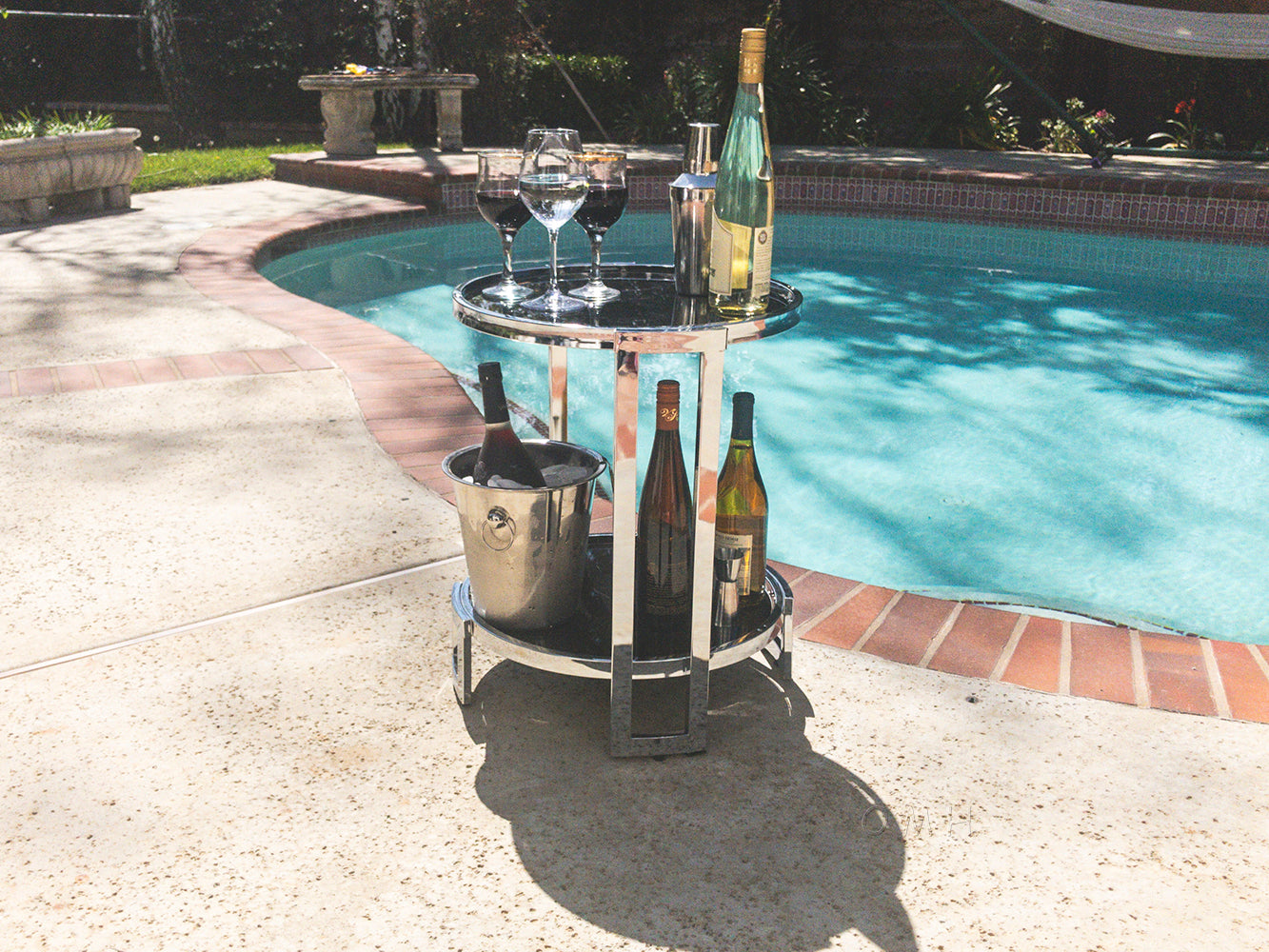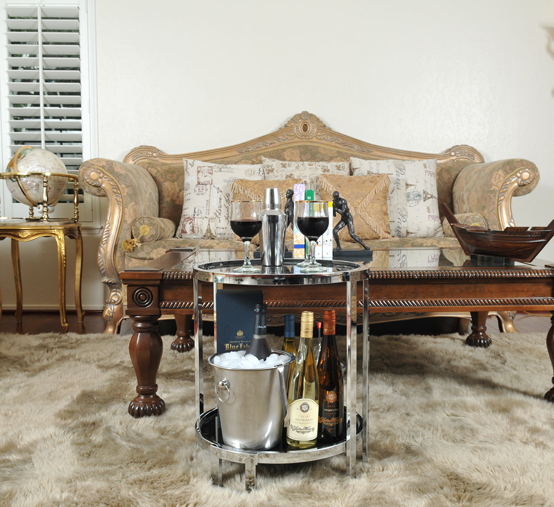 This made in Taiwan Anne Home round end table features a sleek sparkly and durable chrome frame. The upper and lower black tempered glass is nearly opaque, contrasts the chrome nicely, and adds a level of contemporary elegance to any space in your home. It is perfect for displaying a variety of beverages and wine accessories. The design is timeless, compact, and versatile. It can fit anywhere in your home or be used as a solo accent piece. Assembly is required. Note: Wine glasses and all other accessories are not included.